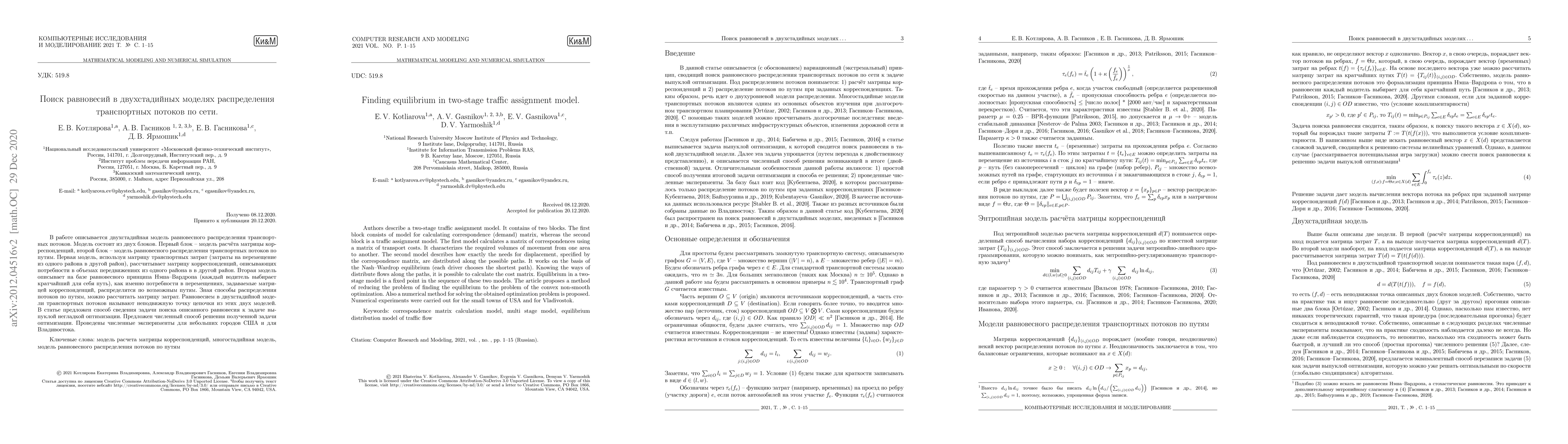 Researchers propose a new method to find equilibrium in two-stage traffic assignment models, reducing the problem to convex non-smooth optimization, with potential applications for small towns.