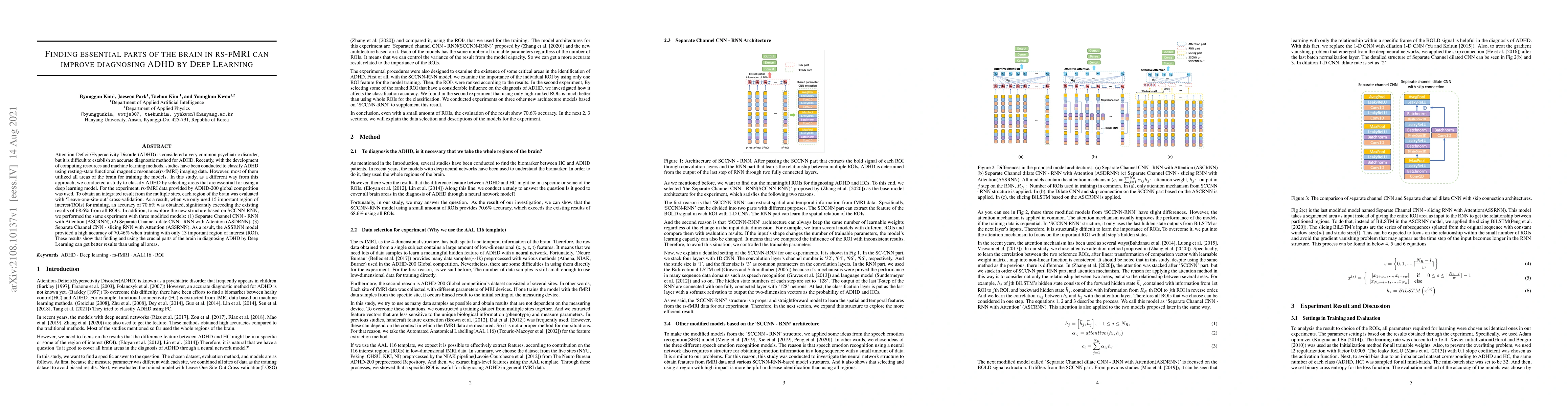 Attention Deficit\Hyperactivity Disorder(ADHD) is considered a very common psychiatric disorder, but it is difficult to establish an accurate diagnostic method for ADHD. Recently, with the development of computing resources and machine learning methods, studies have been conducted to classify ADHD using resting-state functional magnetic resonance(rsfMRI) imaging data. However, most of them utilized all areas of the brain for training the models. In this study, as a different way from this approach, we conducted a study to classify ADHD by selecting areas that are essential for using a deep learning model. For the experiment, rsfMRI data provided by ADHD 200 global competition was used. To obtain an integrated result from the multiple sites, each region of the brain was evaluated with Leave one site out cross-validation. As a result, when we only used 15 important region of interest(ROIs) for training, an accuracy of 70.6% was obtained, significantly exceeding the existing results of 68.6% from all ROIs. In addition, to explore the new structure based on SCCNN-RNN, we performed the same experiment with three modified models: (1) Separate Channel CNN RNN with Attention (ASCRNN), (2) Separate Channel dilate CNN RNN with Attention (ASDRNN), (3) Separate Channel CNN slicing RNN with Attention (ASSRNN). As a result, the ASSRNN model provided a high accuracy of 70.46% when training with only 13 important region of interest (ROI). These results show that finding and using the crucial parts of the brain in diagnosing ADHD by Deep Learning can get better results than using all areas.