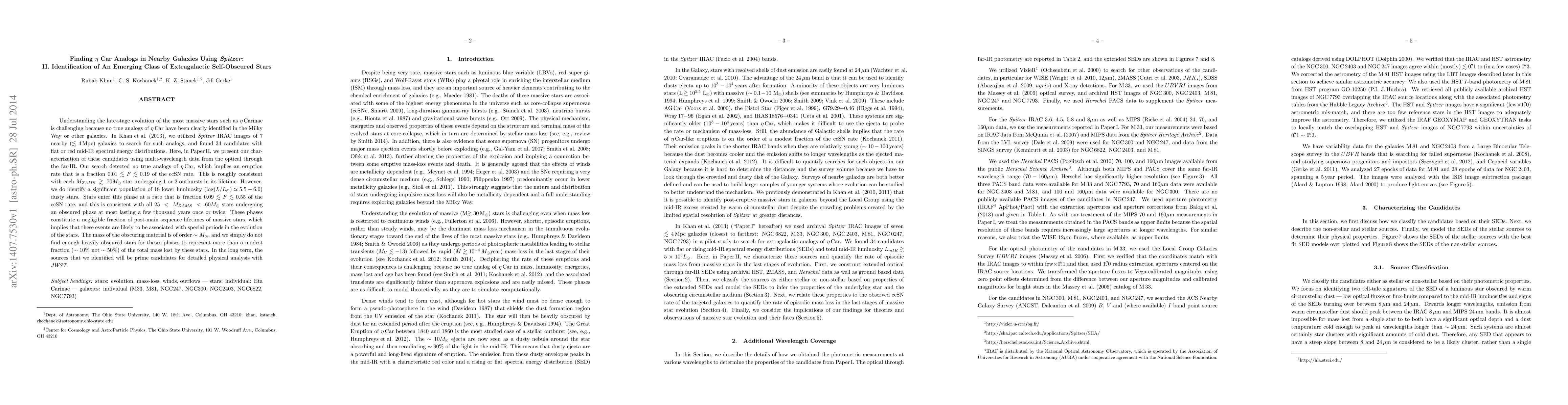 Understanding the late-stage evolution of the most massive stars such as $\eta$ Carinae is challenging because no true analogs of $\eta$ Car have been clearly identified in the Milky Way or other galaxies. In Khan et. al. (2013), we utilized Spitzer IRAC images of $7$ nearby ($\lesssim4$ Mpc) galaxies to search for such analogs, and found $34$ candidates with flat or red mid-IR spectral energy distributions. Here, in Paper II, we present our characterization of these candidates using multi-wavelength data from the optical through the far-IR. Our search detected no true analogs of $\eta$ Car, which implies an eruption rate that is a fraction $0.01\lesssim F \lesssim 0.19$ of the ccSN rate. This is roughly consistent with each $M_{ZAMS} \gtrsim 70M_\odot$ star undergoing $1$ or $2$ outbursts in its lifetime. However, we do identify a significant population of $18$ lower luminosity $\left(\log(L/L_\odot)\simeq5.5-6.0\right)$ dusty stars. Stars enter this phase at a rate that is fraction $0.09 \lesssim F \lesssim 0.55$ of the ccSN rate, and this is consistent with all $25 < M_{ZAMS} < 60M_\odot$ stars undergoing an obscured phase at most lasting a few thousand years once or twice. These phases constitute a negligible fraction of post-main sequence lifetimes of massive stars, which implies that these events are likely to be associated with special periods in the evolution of the stars. The mass of the obscuring material is of order $\sim M_\odot$, and we simply do not find enough heavily obscured stars for theses phases to represent more than a modest fraction ($\sim 10\%$ not $\sim 50\%$) of the total mass lost by these stars. In the long term, the sources that we identified will be prime candidates for detailed physical analysis with JWST.