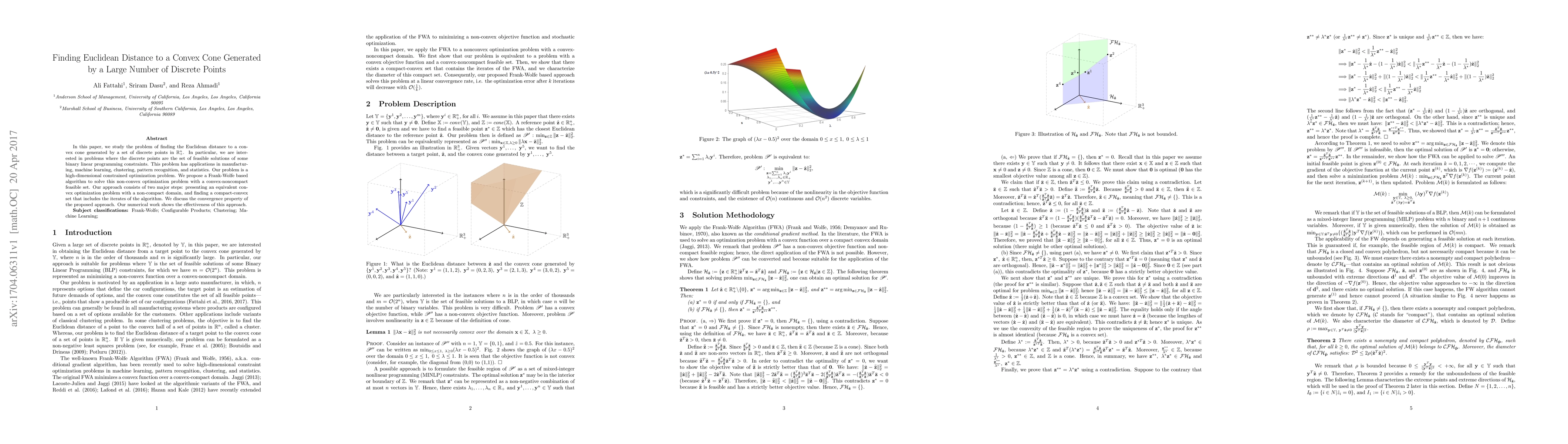 In this paper, we study the problem of finding the Euclidean distance to a convex cone generated by a set of discrete points in $\mathbb{R}^n_+$. In particular, we are interested in problems where the discrete points are the set of feasible solutions of some binary linear programming constraints. This problem has applications in manufacturing, machine learning, clustering, pattern recognition, and statistics. Our problem is a high-dimensional constrained optimization problem. We propose a Frank-Wolfe based algorithm to solve this non-convex optimization problem with a convex-noncompact feasible set. Our approach consists of two major steps: presenting an equivalent convex optimization problem with a non-compact domain, and finding a compact-convex set that includes the iterates of the algorithm. We discuss the convergence property of the proposed approach. Our numerical work shows the effectiveness of this approach.