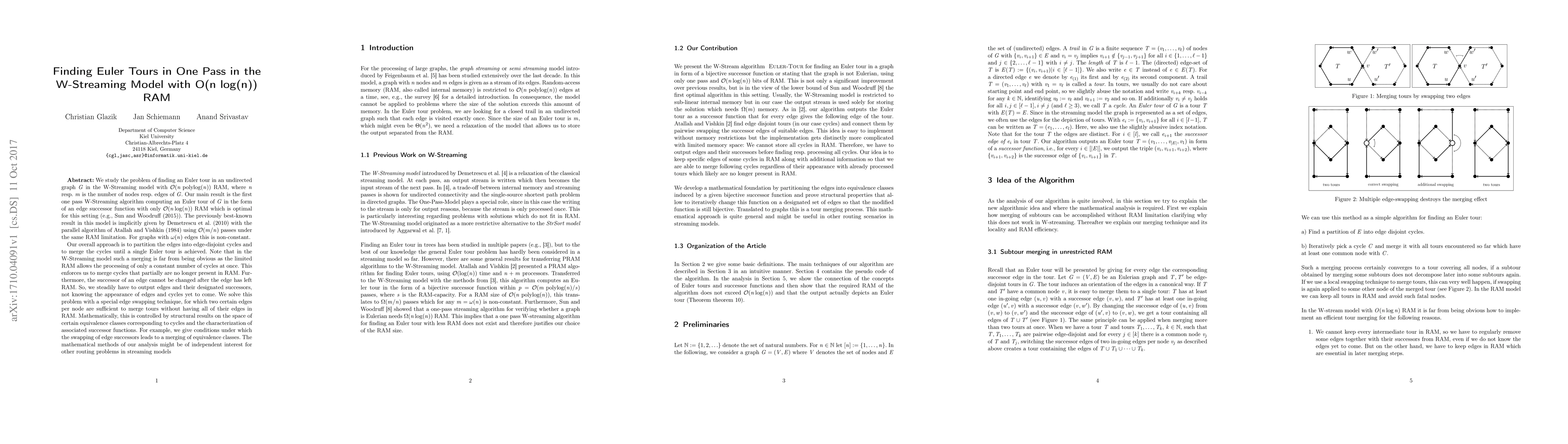 We study the problem of finding an Euler tour in an undirected graph G in the W-Streaming model with O(n polylog(n)) RAM, where n resp. m is the number of nodes resp. edges of G. Our main result is the first one pass W-Streaming algorithm computing an Euler tour of G in the form of an edge successor function with only O(n log(n)) RAM which is optimal for this setting (e.g., Sun and Woodruff (2015)). The previously best-known result in this model is implicitly given by Demetrescu et al. (2010) with the parallel algorithm of Atallah and Vishkin (1984) using O(m/n) passes under the same RAM limitation. For graphs with \omega(n) edges this is non-constant. Our overall approach is to partition the edges into edge-disjoint cycles and to merge the cycles until a single Euler tour is achieved. Note that in the W-Streaming model such a merging is far from being obvious as the limited RAM allows the processing of only a constant number of cycles at once. This enforces us to merge cycles that partially are no longer present in RAM. Furthermore, the successor of an edge cannot be changed after the edge has left RAM. So, we steadily have to output edges and their designated successors, not knowing the appearance of edges and cycles yet to come. We solve this problem with a special edge swapping technique, for which two certain edges per node are sufficient to merge tours without having all of their edges in RAM. Mathematically, this is controlled by structural results on the space of certain equivalence classes corresponding to cycles and the characterization of associated successor functions. For example, we give conditions under which the swapping of edge successors leads to a merging of equivalence classes.