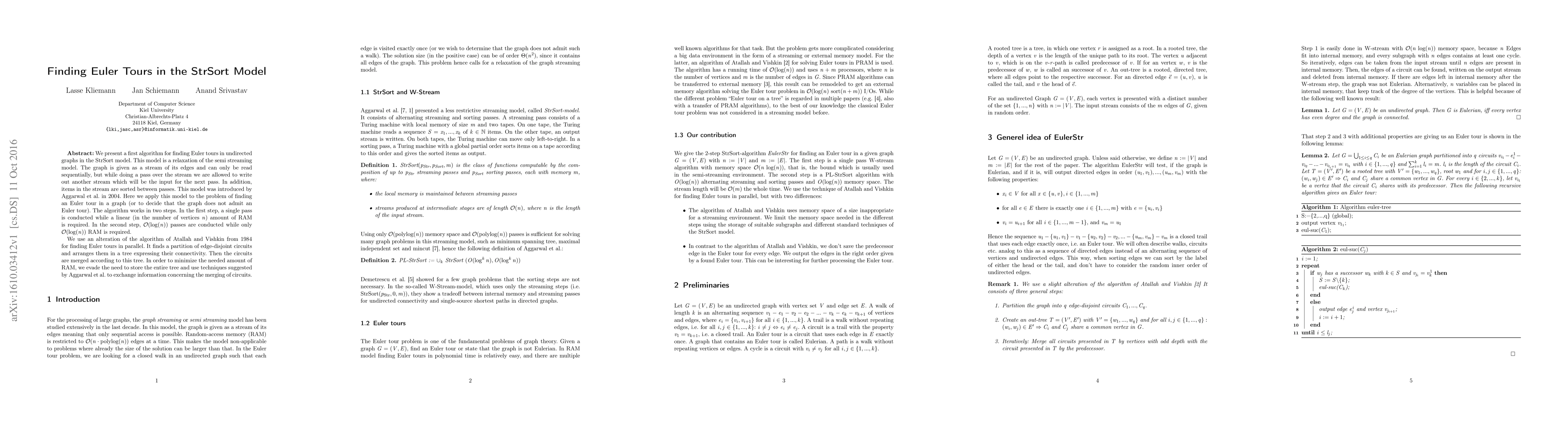 This paper introduces an algorithm for finding Euler tours in undirected graphs within the StrSort model, which allows sequential reading and sorted data between passes. The algorithm operates in two steps: an initial single-pass with linear RAM usage followed by $\mathcal O(\log(n))$ passes with minimal RAM. It adapts the parallel Euler tour algorithm from Atallah and Vishkin, optimizing memory usage by avoiding full tree storage.