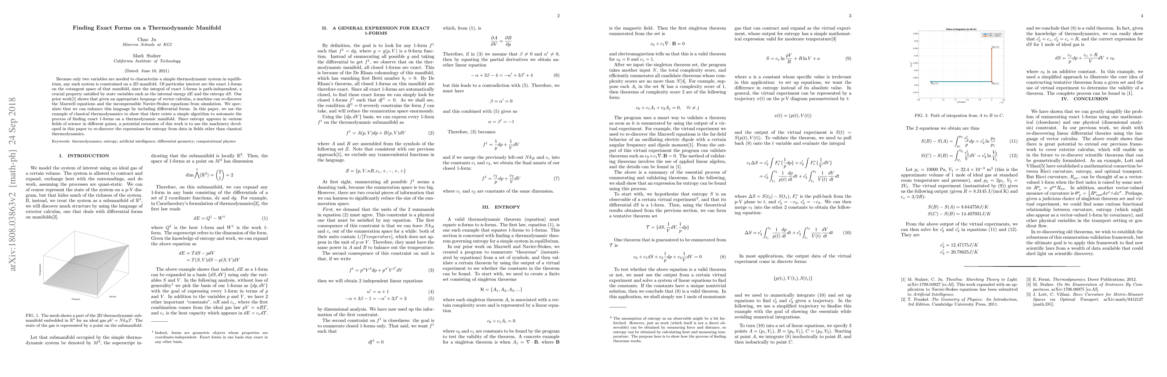 Because only two variables are needed to characterize a simple thermodynamic system in equilibrium, any such system is constrained on a 2D manifold. Of particular interest are the exact 1-forms on the cotangent space of that manifold, since the integral of exact 1-forms is path-independent, a crucial property satisfied by state variables such as the internal energy dE and the entropy dS. Our prior work shows that given an appropriate language of vector calculus, a machine can re-discover the Maxwell equations and the incompressible Navier-Stokes equations from simulation. We speculate that we can enhance this language by including differential forms. In this paper, we use the example of classical thermodynamics to show that there exists a simple algorithm to automate the process of finding exact 1-forms on a thermodynamic manifold. Since entropy appears in various fields of science in different guises, a potential extension of this work is to use the machinery developed in this paper to re-discover the expressions for entropy from data in fields other than classical thermodynamics.
