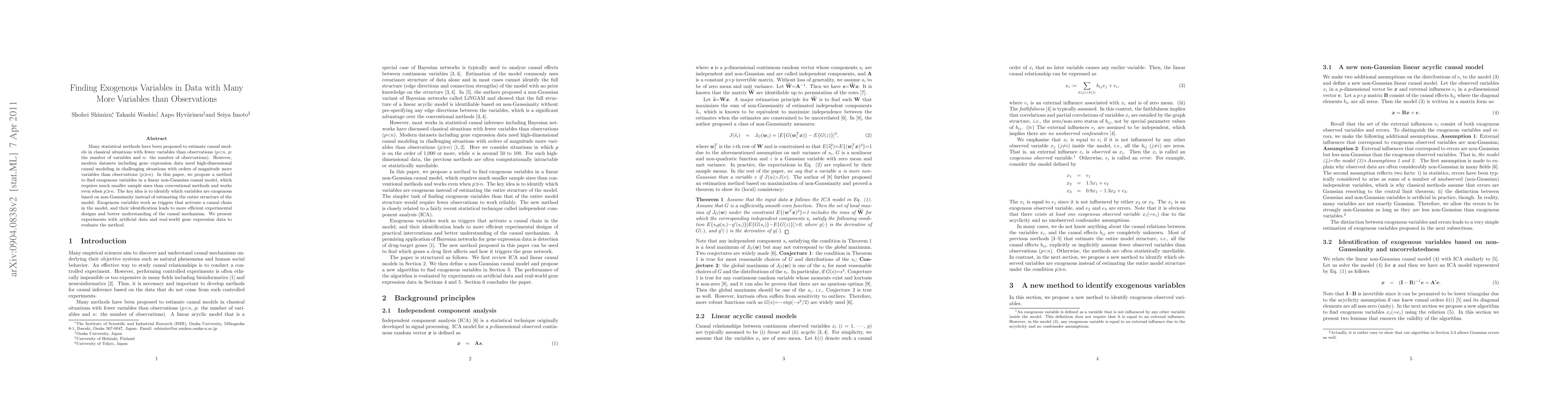 A new method identifies exogenous variables in high-dimensional causal models with many more variables than observations, requiring smaller sample sizes and working even when there are more variables than observations. The approach leverages non-Gaussianity to efficiently discover exogenous triggers that activate a causal chain.