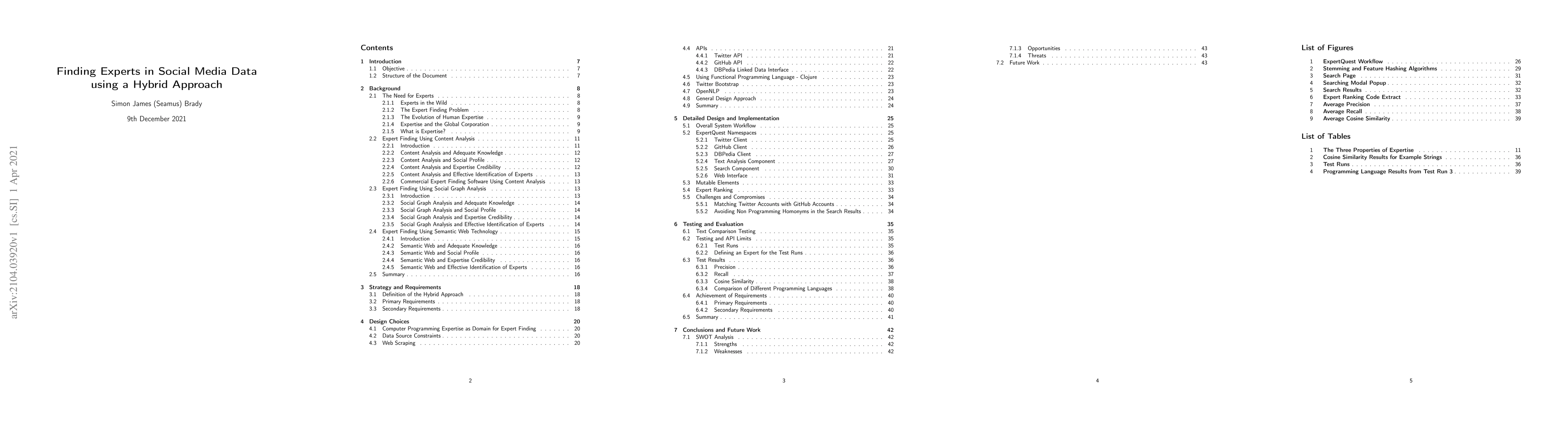 Several approaches to the problem of expert finding have emerged in computer science research. In this work, three of these approaches - content analysis, social graph analysis and the use of Semantic Web technologies are examined. An integrated set of system requirements is then developed that uses all three approaches in one hybrid approach. To show the practicality of this hybrid approach, a usable prototype expert finding system called ExpertQuest is developed using a modern functional programming language (Clojure) to query social media data and Linked Data. This system is evaluated and discussed. Finally, a discussion and conclusions are presented which describe the benefits and shortcomings of the hybrid approach and the technologies used in this work.
