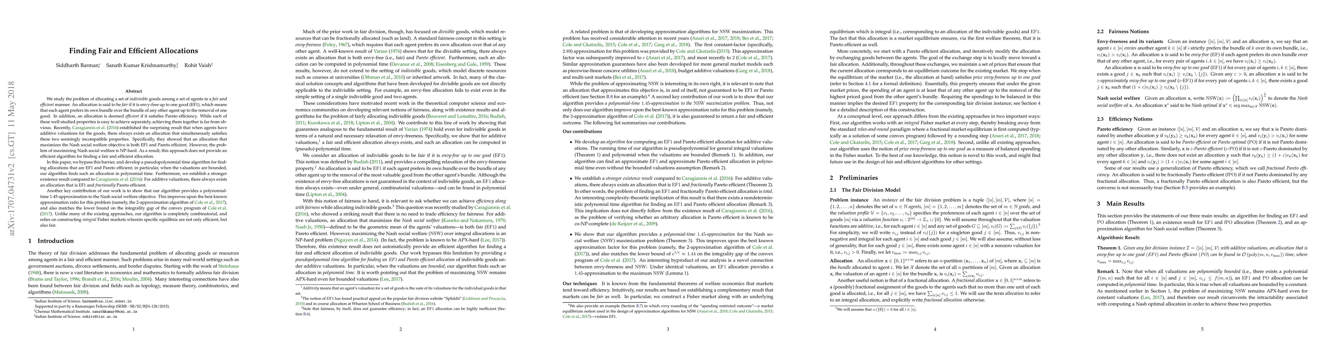 This paper develops a pseudopolynomial time algorithm to find envy-free up to one good (EF1) and Pareto optimal (PO) allocations for indivisible goods, achieving polynomial runtime when valuations are bounded. It also establishes the existence of EF1 and fractionally PO allocations for additive valuations, and provides a 1.45-approximation to the Nash social welfare objective, improving upon previous 2-approximation methods.