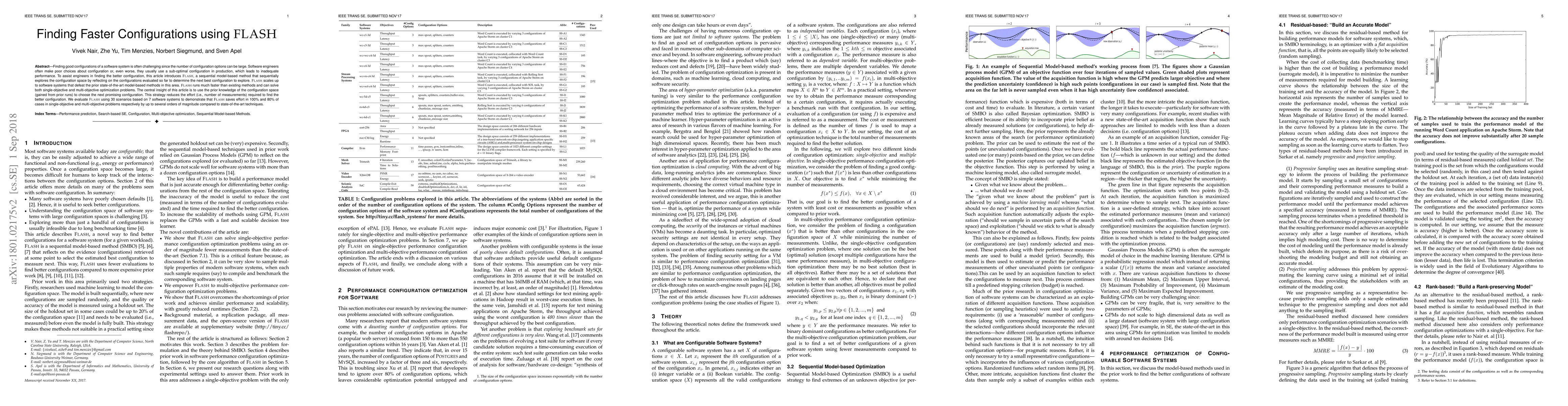 Finding good configurations for a software system is often challenging since the number of configuration options can be large. Software engineers often make poor choices about configuration or, even worse, they usually use a sub-optimal configuration in production, which leads to inadequate performance. To assist engineers in finding the (near) optimal configuration, this paper introduces FLASH, a sequential model-based method, which sequentially explores the configuration space by reflecting on the configurations evaluated so far to determine the next best configuration to explore. FLASH scales up to software systems that defeat the prior state of the art model-based methods in this area. FLASH runs much faster than existing methods and can solve both single-objective and multi-objective optimization problems. The central insight of this paper is to use the prior knowledge (gained from prior runs) to choose the next promising configuration. This strategy reduces the effort (i.e., number of measurements) required to find the (near) optimal configuration. We evaluate FLASH using 30 scenarios based on 7 software systems to demonstrate that FLASH saves effort in 100% and 80% of cases in single-objective and multi-objective problems respectively by up to several orders of magnitude compared to the state of the art techniques.