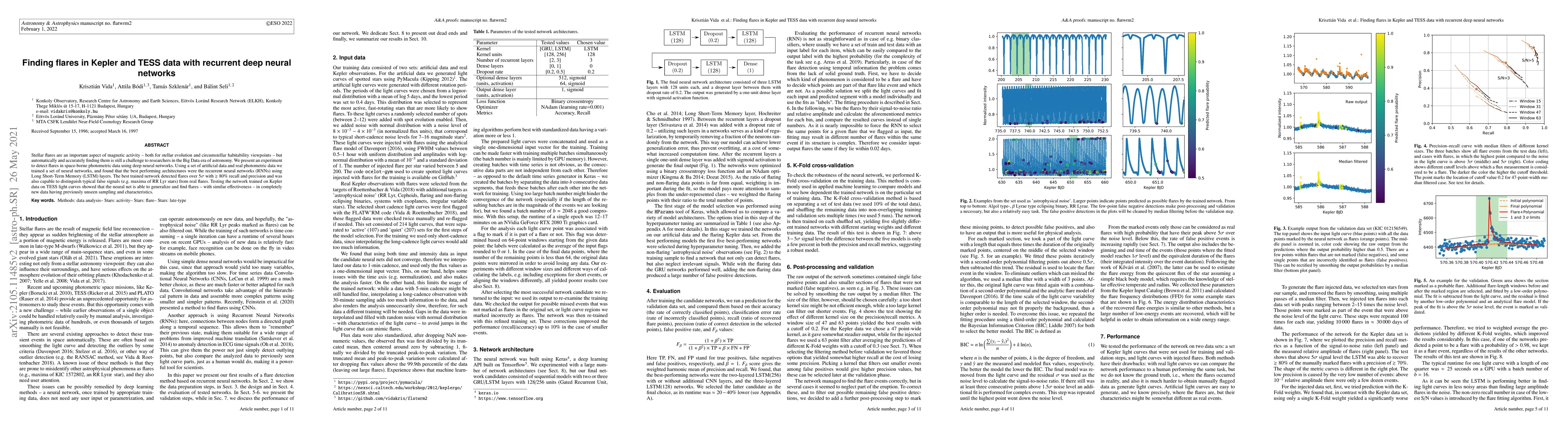 A study used deep neural networks to detect stellar flares in space-borne data, finding that recurrent neural networks with Long Short-Term Memory layers were the most effective at detecting flares with high accuracy and precision.