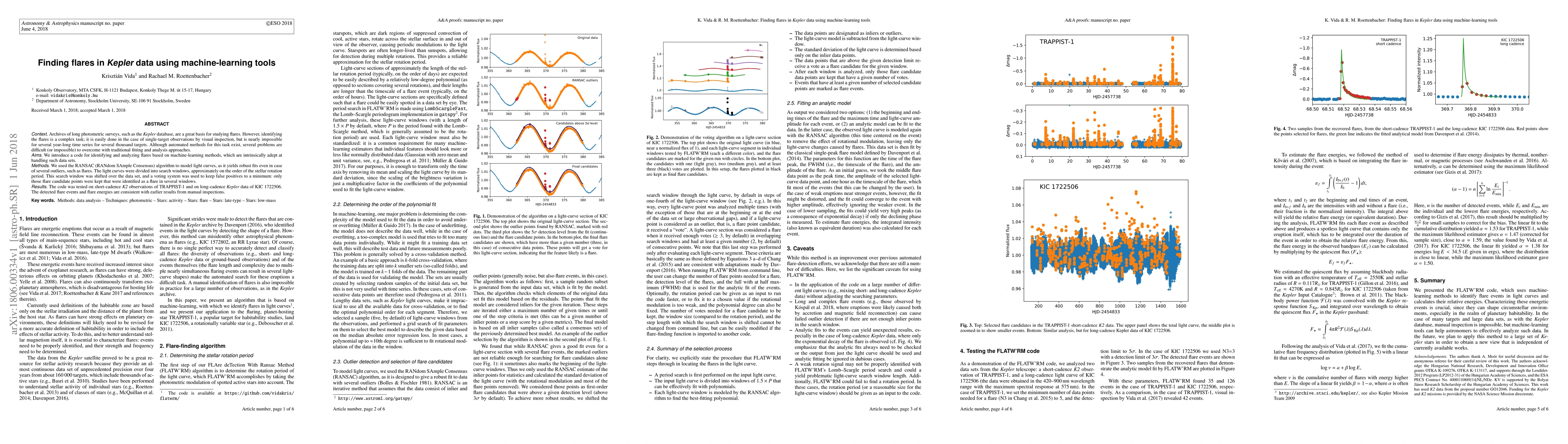 Researchers developed a machine learning method to identify flares in Kepler data, using the RANSAC algorithm to model light curves and a voting system to filter false positives, with promising results in testing on TRAPPIST-1 and KIC 1722506 data.