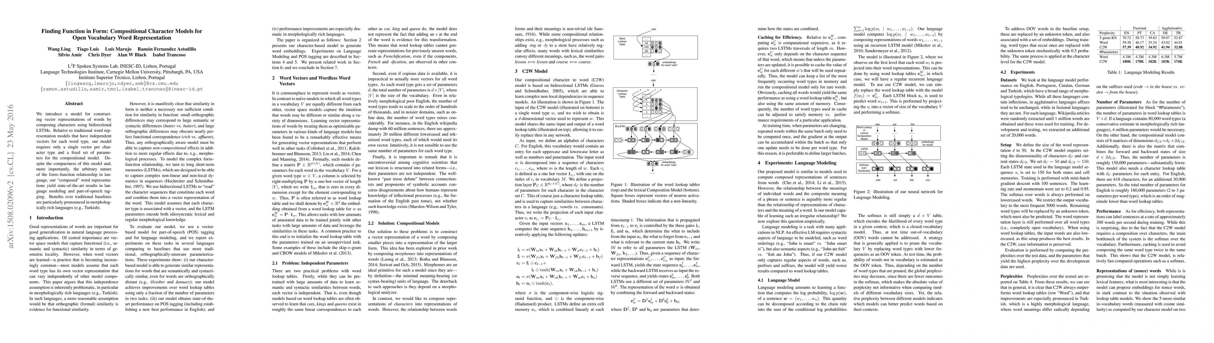 This paper proposes a compositional character model using bidirectional LSTMs to generate word representations by composing characters, requiring only a single vector per character type and fixed parameters. The model achieves state-of-the-art results in language modeling and part-of-speech tagging, especially in morphologically rich languages.