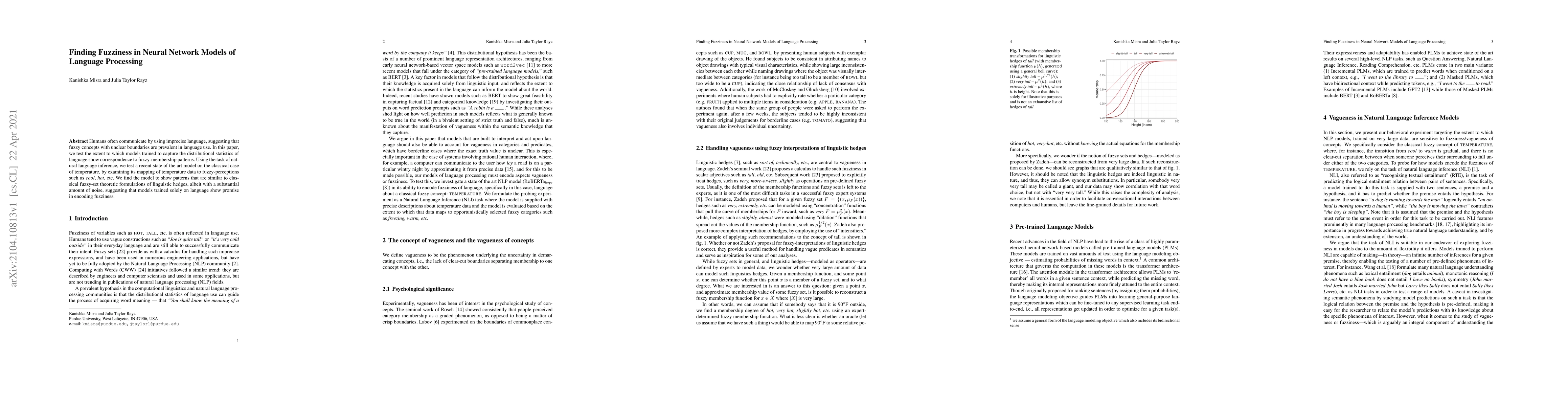 Humans often communicate by using imprecise language, suggesting that fuzzy concepts with unclear boundaries are prevalent in language use. In this paper, we test the extent to which models trained to capture the distributional statistics of language show correspondence to fuzzy-membership patterns. Using the task of natural language inference, we test a recent state of the art model on the classical case of temperature, by examining its mapping of temperature data to fuzzy-perceptions such as "cool", "hot", etc. We find the model to show patterns that are similar to classical fuzzy-set theoretic formulations of linguistic hedges, albeit with a substantial amount of noise, suggesting that models trained solely on language show promise in encoding fuzziness.