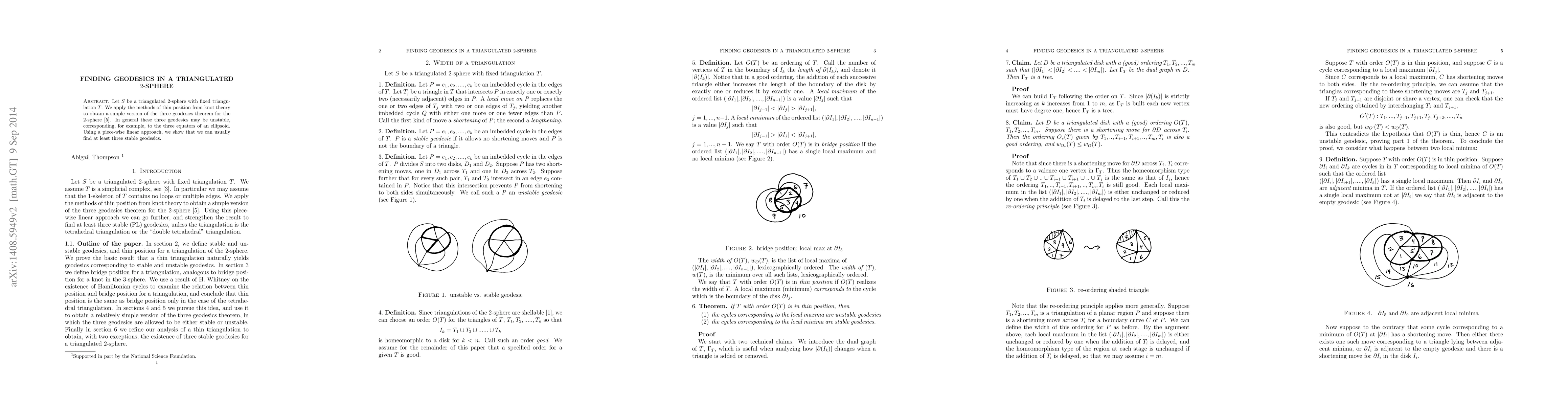 This paper applies knot theory's thin position methods to triangulated 2-spheres to demonstrate the existence of at least three stable geodesics, contrasting with the potentially unstable geodesics found in ellipsoidal models.