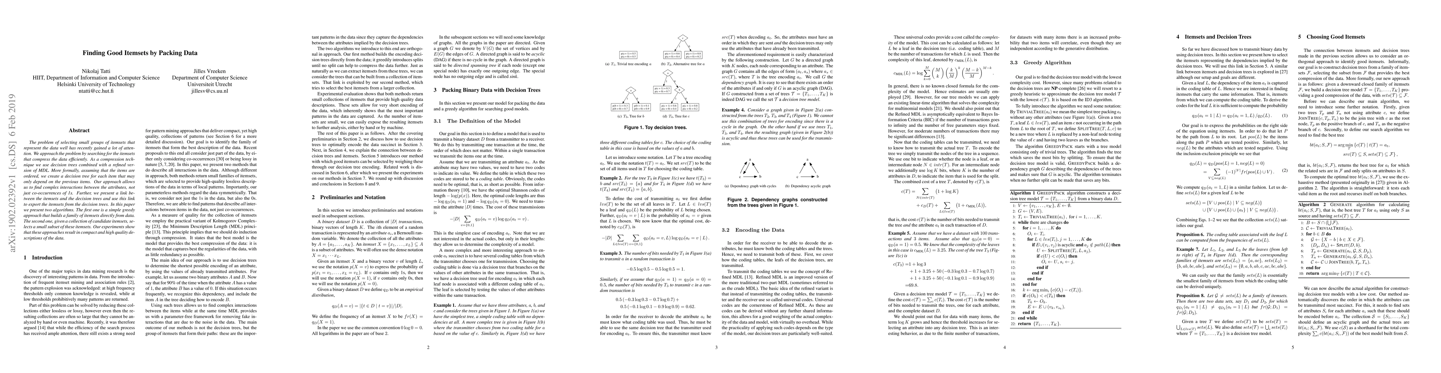 The problem of selecting small groups of itemsets that represent the data well has recently gained a lot of attention. We approach the problem by searching for the itemsets that compress the data efficiently. As a compression technique we use decision trees combined with a refined version of MDL. More formally, assuming that the items are ordered, we create a decision tree for each item that may only depend on the previous items. Our approach allows us to find complex interactions between the attributes, not just co-occurrences of 1s. Further, we present a link between the itemsets and the decision trees and use this link to export the itemsets from the decision trees. In this paper we present two algorithms. The first one is a simple greedy approach that builds a family of itemsets directly from data. The second one, given a collection of candidate itemsets, selects a small subset of these itemsets. Our experiments show that these approaches result in compact and high quality descriptions of the data.
