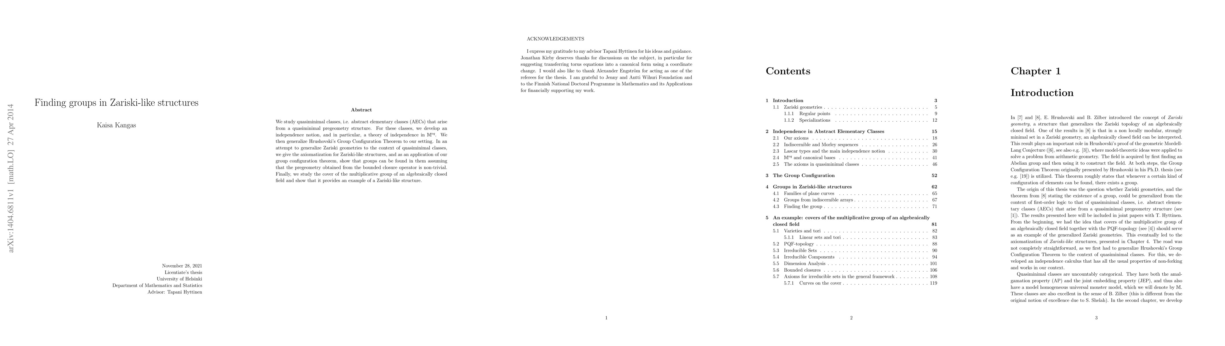 This paper develops an independence theory for quasiminimal classes and generalizes Hrushovski's Group Configuration Theorem to Zariski-like structures, proving that non-trivial pregeometry leads to the existence of groups within these structures. An example is provided by the cover of the multiplicative group of an algebraically closed field.