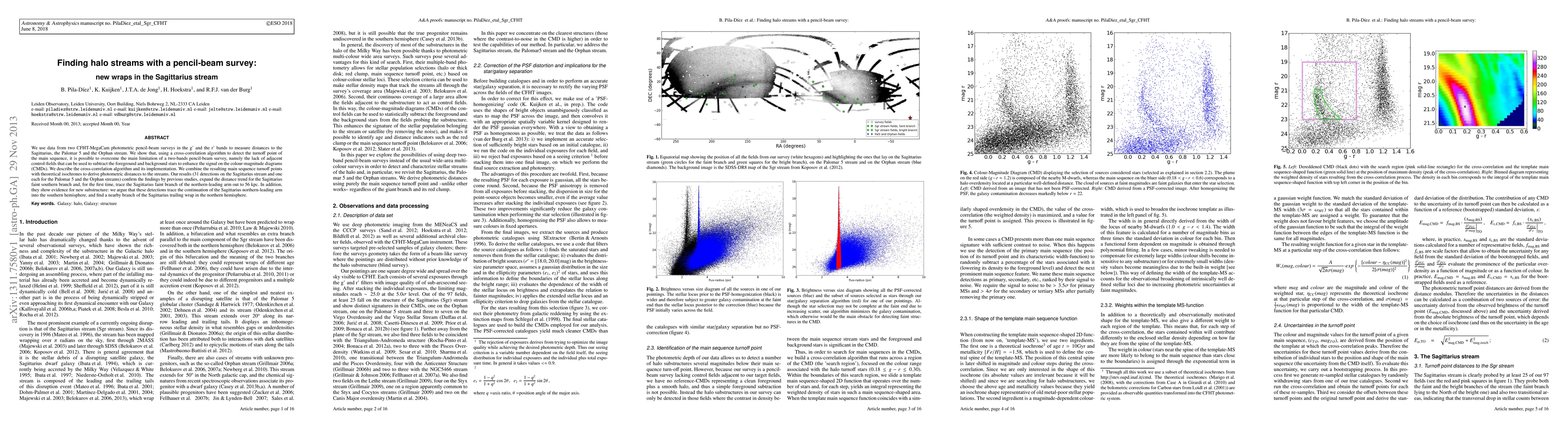 We use data from two CFHT-MegaCam photometric pencil-beam surveys in the g' and the r' bands to measure distances to the Sagittarius, the Palomar 5 and the Orphan stream. We show that, using a cross-correlation algorithm to detect the turnoff point of the main sequence, it is possible to overcome the main limitation of a two-bands pencil-beam survey, namely the lack of adjacent control-fields that can be used to subtract the foreground and background stars to enhance the signal on the colour-magnitude diagrams (CMDs). We describe the cross-correlation algorithm and its implementation. We combine the resulting main sequence turnoff points with theoretical isochrones to derive photometric distances to the streams. Our results (31 detections on the Sagittarius stream and one each for the Palomar 5 and the Orphan streams) confirm the findings by previous studies, expand the distance trend for the Sagittarius faint southern branch and, for the first time, trace the Sagittarius faint branch of the northern-leading arm out to 56 kpc. In addition, they show evidence for new substructure: we argue that these detections trace the continuation of the Sagittarius northern-leading arm into the southern hemisphere, and find a nearby branch of the Sagittarius trailing wrap in the northern hemisphere.