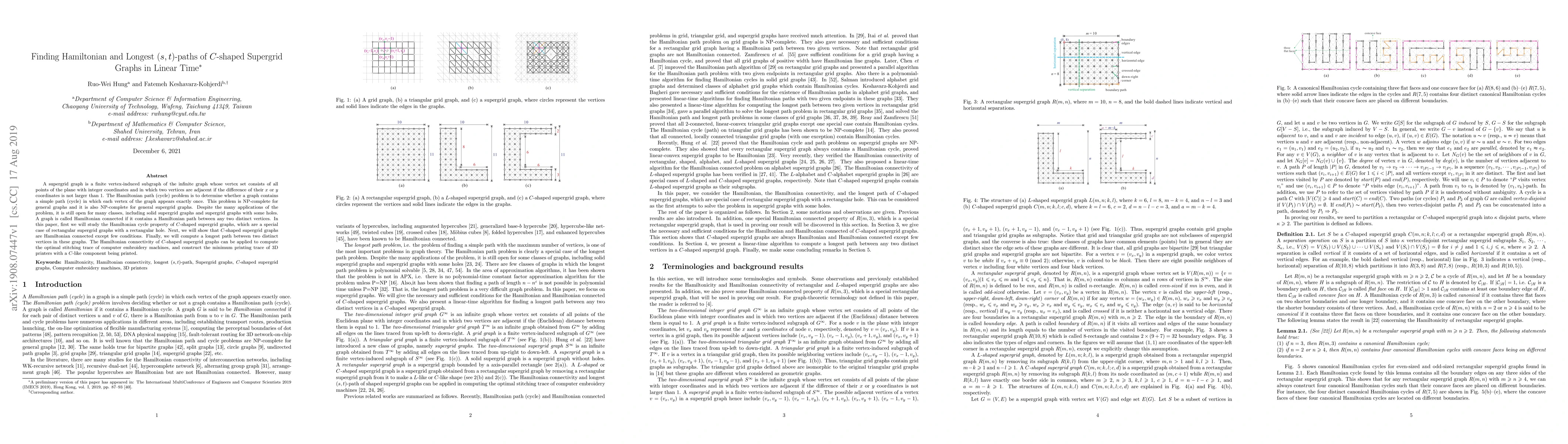 This paper explores Hamiltonian cycles and longest (s, t)-paths in C-shaped supergrid graphs, demonstrating Hamiltonian connectivity in most cases except for specific conditions, and presenting linear-time algorithms for these computations. Applications include optimal stitching traces for embroidery machines and minimum printing paths for 3D printers.