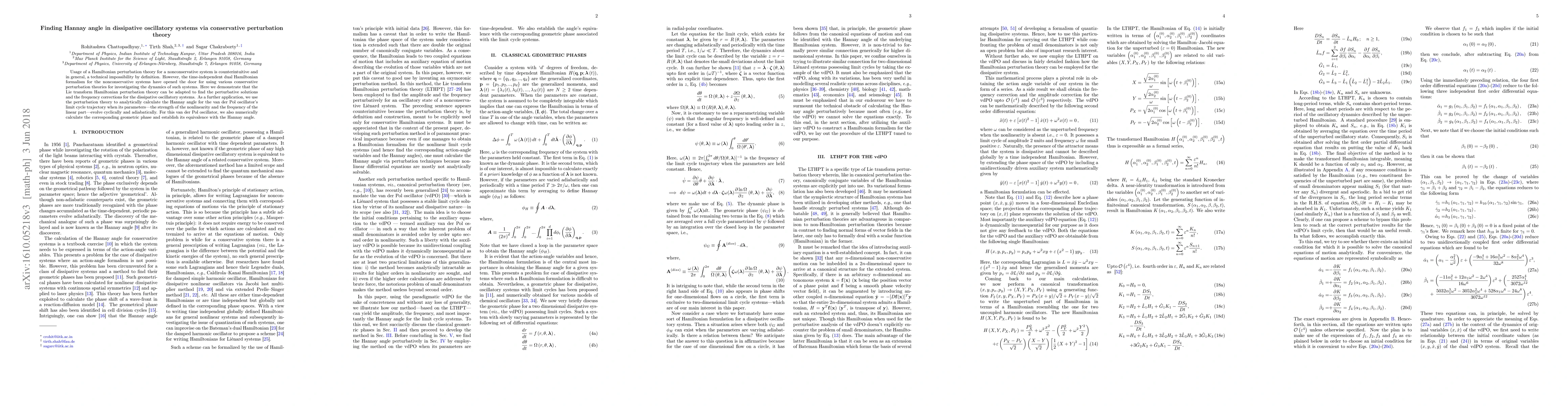 This paper explores adapting Lie transform Hamiltonian perturbation theory to study dissipative oscillatory systems, demonstrating its application to calculate the Hannay angle for the van der Pol oscillator. It analytically computes the Hannay angle and numerically verifies its equivalence with the geometric phase.