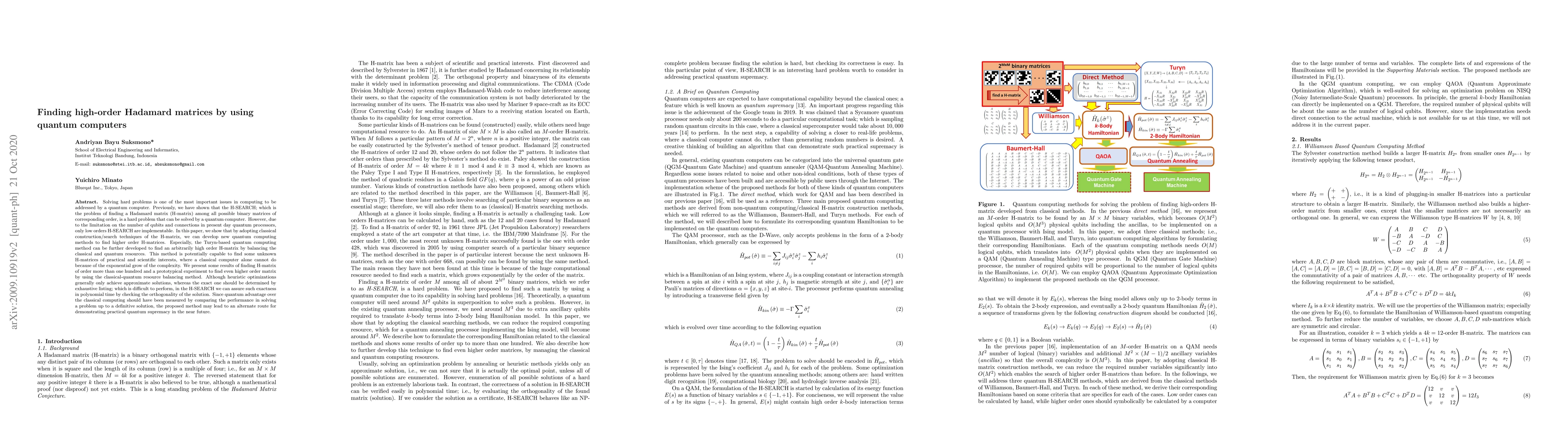 Solving hard problems is one of the most important issues in computing to be addressed by a quantum computer. Previously, we have shown that the H-SEARCH; which is the problem of finding a Hadamard matrix (H-matrix) among all possible binary matrices of corresponding order, is a hard problem that can be solved by a quantum computer. However, due to the limitation on the number of qubits and connections in present day quantum processors, only low orders H-SEARCH are implementable. In this paper, we show that by adopting classical construction/search techniques of the H-matrix, we can develop new quantum computing methods to find higher order H-matrices. Especially, the Turyn-based quantum computing method can be further developed to find an arbitrarily high order H-matrix by balancing the classical and quantum resources. This method is potentially capable to find some unknown H-matrices of practical and scientific interests, where a classical computer alone cannot do because of the exponential grow of the complexity. We present some results of finding H-matrix of order more than one hundred and a prototypical experiment to find even higher order matrix by using the classical-quantum resource balancing method. Although heuristic optimizations generally only achieve approximate solutions, whereas the exact one should be determined by exhaustive listing; which is difficult to perform, in the H-SEARCH we can assure such exactness in polynomial time by checking the orthogonality of the solution. Since quantum advantage over the classical computing should have been measured by comparing the performance in solving a problem up to a definitive solution, the proposed method may lead to an alternate route for demonstrating practical quantum supremacy in the near future.