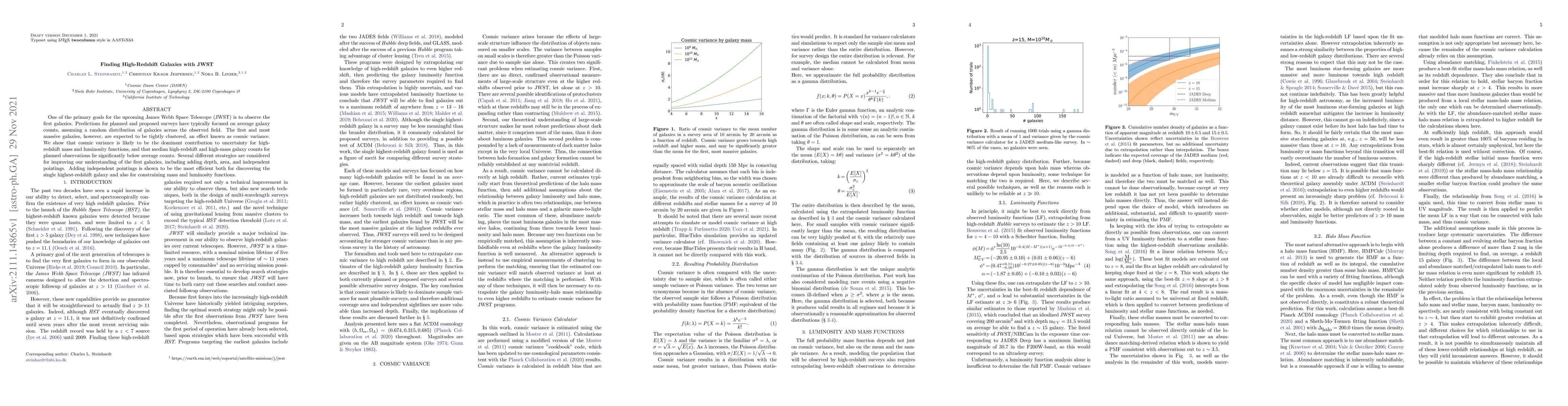 This paper discusses the challenges of observing high-redshift galaxies with the JWST, emphasizing that cosmic variance likely dominates uncertainties in mass and luminosity functions. It concludes that adding independent pointings to observations is the most efficient strategy for discovering high-redshift galaxies and constraining their mass and luminosity functions.