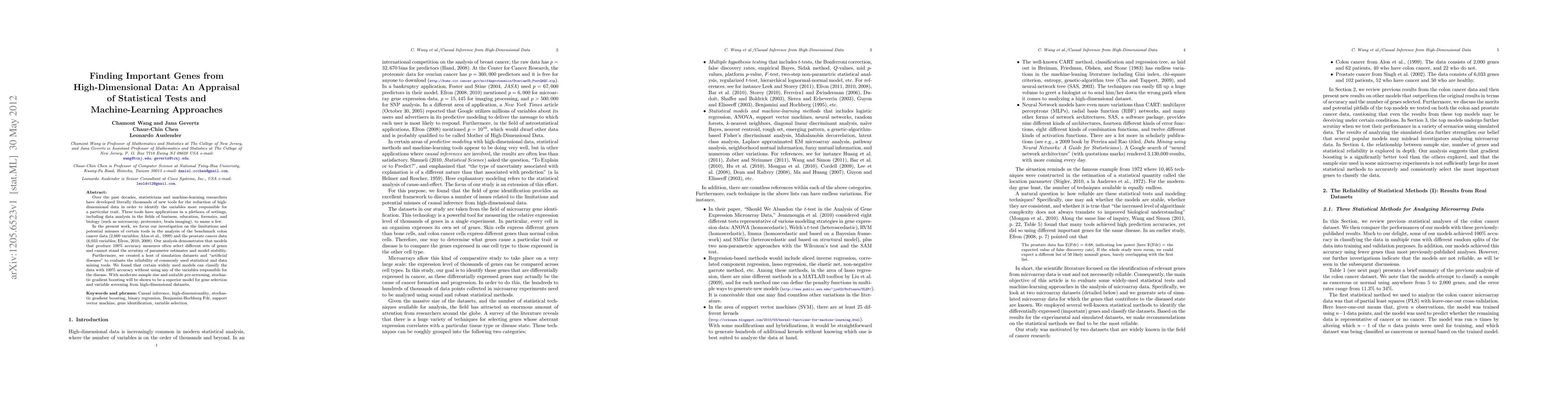 Over the past decades, statisticians and machine-learning researchers have developed literally thousands of new tools for the reduction of high-dimensional data in order to identify the variables most responsible for a particular trait. These tools have applications in a plethora of settings, including data analysis in the fields of business, education, forensics, and biology (such as microarray, proteomics, brain imaging), to name a few. In the present work, we focus our investigation on the limitations and potential misuses of certain tools in the analysis of the benchmark colon cancer data (2,000 variables; Alon et al., 1999) and the prostate cancer data (6,033 variables; Efron, 2010, 2008). Our analysis demonstrates that models that produce 100% accuracy measures often select different sets of genes and cannot stand the scrutiny of parameter estimates and model stability. Furthermore, we created a host of simulation datasets and "artificial diseases" to evaluate the reliability of commonly used statistical and data mining tools. We found that certain widely used models can classify the data with 100% accuracy without using any of the variables responsible for the disease. With moderate sample size and suitable pre-screening, stochastic gradient boosting will be shown to be a superior model for gene selection and variable screening from high-dimensional datasets.