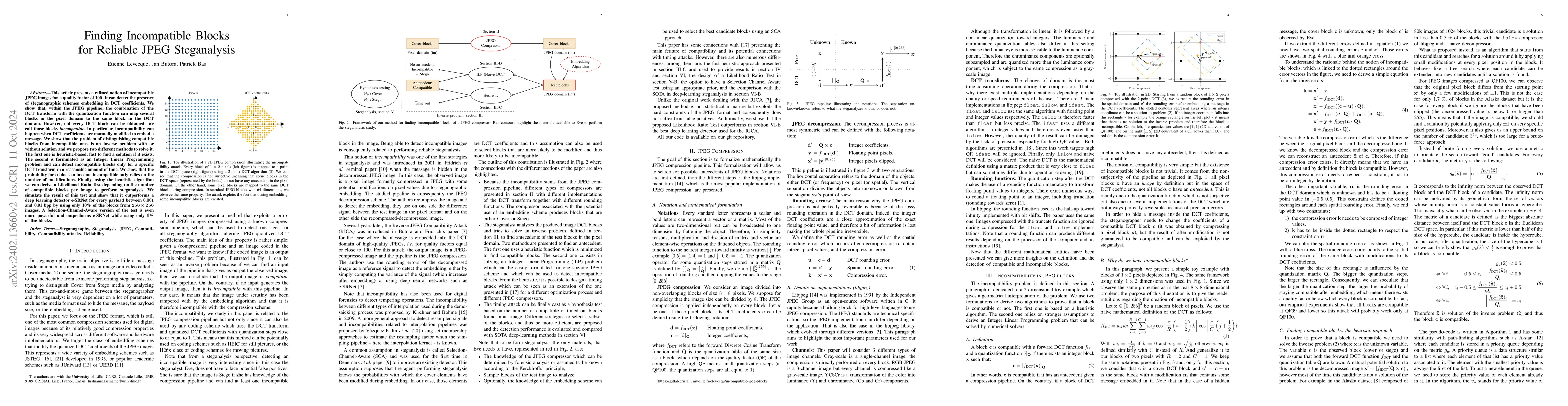 This paper proposes methods to identify incompatible JPEG blocks, which can indicate steganographic embedding. It introduces two approaches: a heuristic method and an Integer Linear Programming solution, demonstrating that the likelihood of block incompatibility depends on the number of modifications. The heuristic-based Likelihood Ratio Test outperforms a deep learning detector across various payloads, especially when using a Selection-Channel-Aware version.