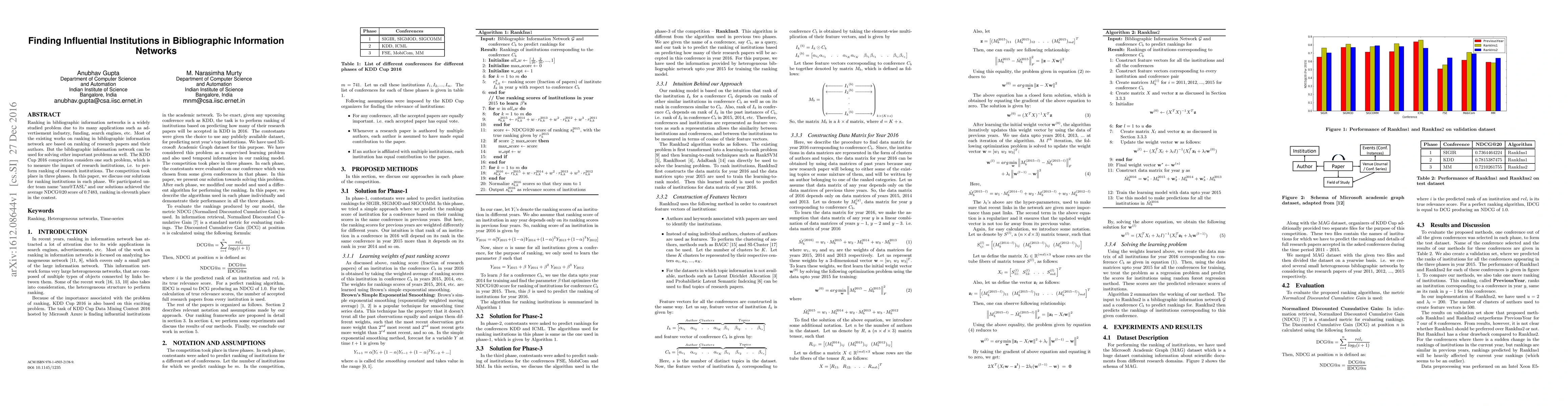 Ranking in bibliographic information networks is a widely studied problem due to its many applications such as advertisement industry, funding, search engines, etc. Most of the existing works on ranking in bibliographic information network are based on ranking of research papers and their authors. But the bibliographic information network can be used for solving other important problems as well. The KDD Cup $2016$ competition considers one such problem, which is to measure the impact of research institutions, i.e. to perform ranking of research institutions. The competition took place in three phases. In this paper, we discuss our solutions for ranking institutions in each phase. We participated under team name "anu@TASL" and our solutions achieved the average NDCG@$20$ score of $0.7483$, ranking in eleventh place in the contest.