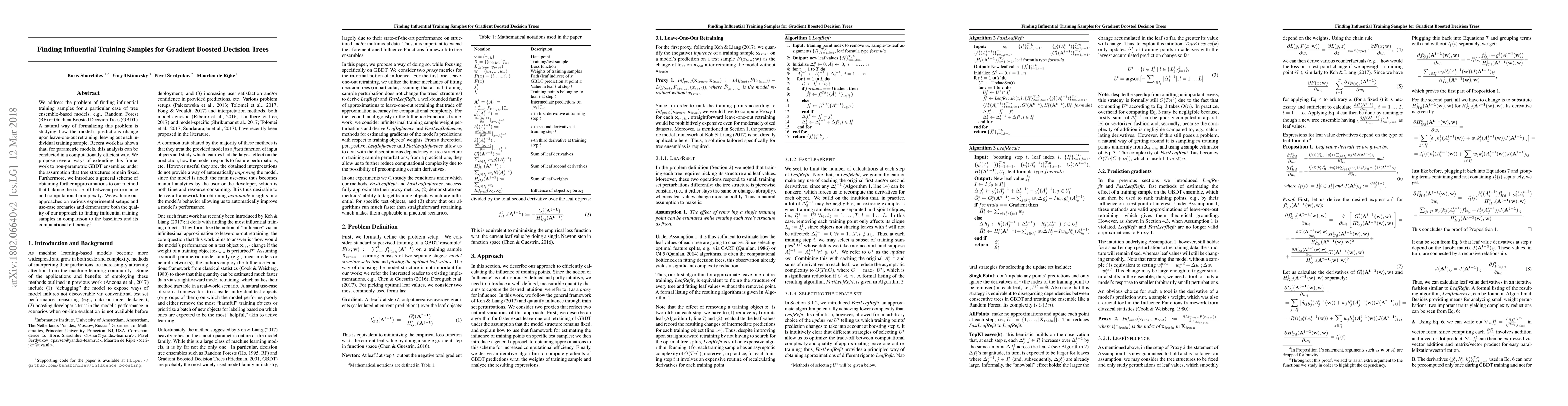 This paper proposes methods to identify influential training samples in Gradient Boosted Decision Trees (GBDT) by analyzing changes in model predictions when each sample is removed. It extends efficient techniques from parametric models to non-parametric GBDT ensembles, balancing performance and computational complexity, and demonstrates effectiveness through experiments.