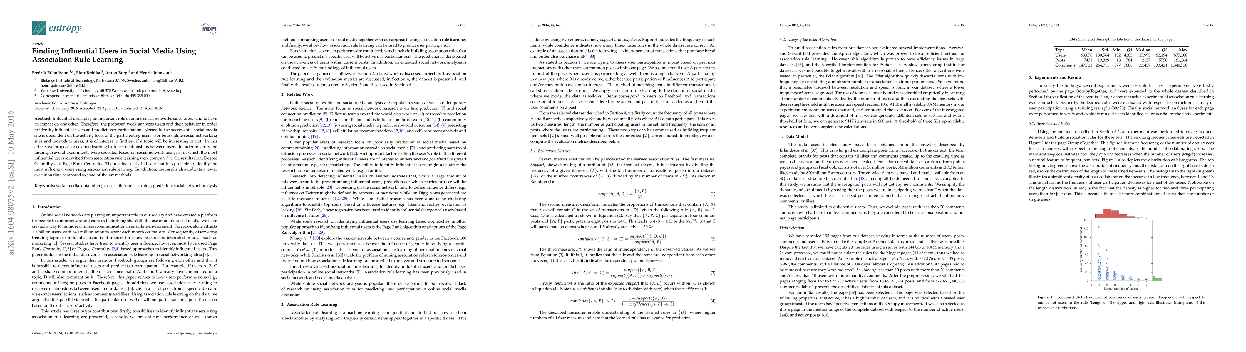 This paper proposes using association rule learning to identify influential users in social media networks, demonstrating its effectiveness through experiments comparing it to Degree Centrality and Page Rank Centrality. The method shows lower execution time and accurately predicts user participation.