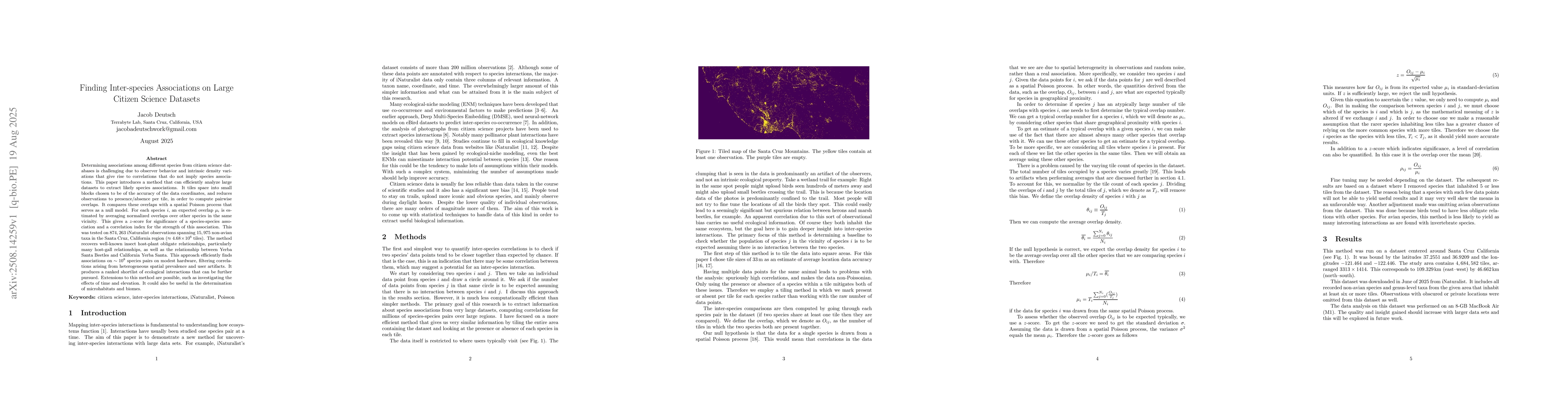Determining associations among different species from citizen science databases is challenging due to observer behavior and intrinsic density variations that give rise to correlations that do not imply species associations. This paper introduces a method that can efficiently analyze large datasets to extract likely species associations. It tiles space into small blocks chosen to be of the accuracy of the data coordinates, and reduces observations to presence/absence per tile, in order to compute pairwise overlaps. It compares these overlaps with a spatial Poisson process that serves as a null model. For each species $i$, an expected overlap $\mu_i$ is estimated by averaging normalized overlaps over other species in the same vicinity. This gives a $z$-score for significance of a species-species association and a correlation index for the strength of this association. This was tested on $874,263$ iNaturalist observations spanning $15,975$ non-avian taxa in the Santa Cruz, California region ($\approx 4.68\times10^{6}$ tiles). The method recovers well-known insect host-plant obligate relationships, particularly many host-gall relationships, as well as the relationship between Yerba Santa Beetles and California Yerba Santa. This approach efficiently finds associations on $\sim10^{8}$ species pairs on modest hardware, filtering correlations arising from heterogeneous spatial prevalence and user artifacts. It produces a ranked shortlist of ecological interactions that can be further pursued. Extensions to this method are possible, such as investigating the effects of time and elevation. It could also be useful in the determination of microhabitats and biomes.