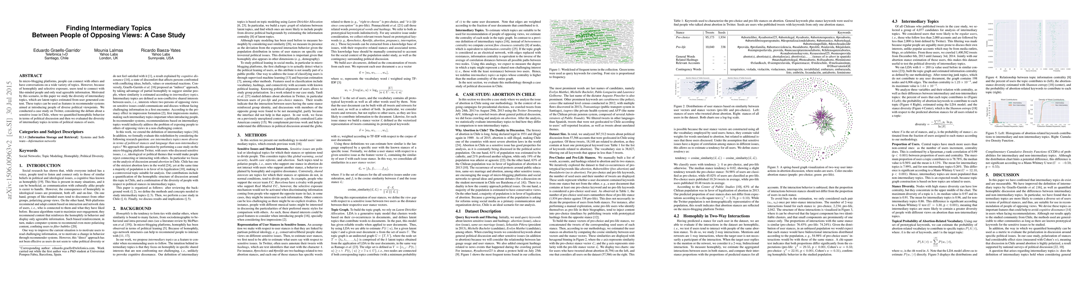 In micro-blogging platforms, people can connect with others and have conversations on a wide variety of topics. However, because of homophily and selective exposure, users tend to connect with like-minded people and only read agreeable information. Motivated by this scenario, in this paper we study the diversity of intermediary topics, which are latent topics estimated from user generated content. These topics can be used as features in recommender systems aimed at introducing people of diverse political viewpoints. We conducted a case study on Twitter, considering the debate about a sensitive issue in Chile, where we quantified homophilic behavior in terms of political discussion and then we evaluated the diversity of intermediary topics in terms of political stances of users.