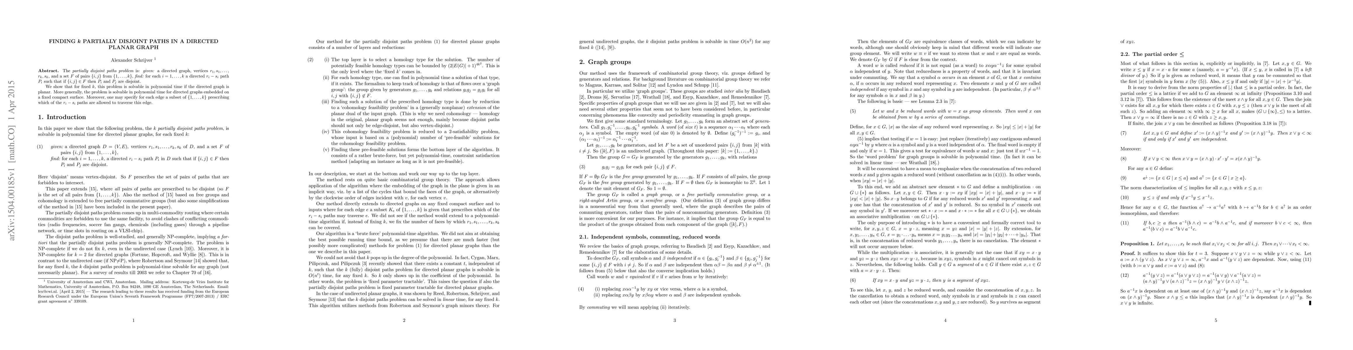 This paper addresses the partially disjoint paths problem in directed planar graphs, showing that it can be solved in polynomial time for fixed k. The problem extends to directed graphs embedded on any fixed compact surface, with optional edge-specific path traversal restrictions.