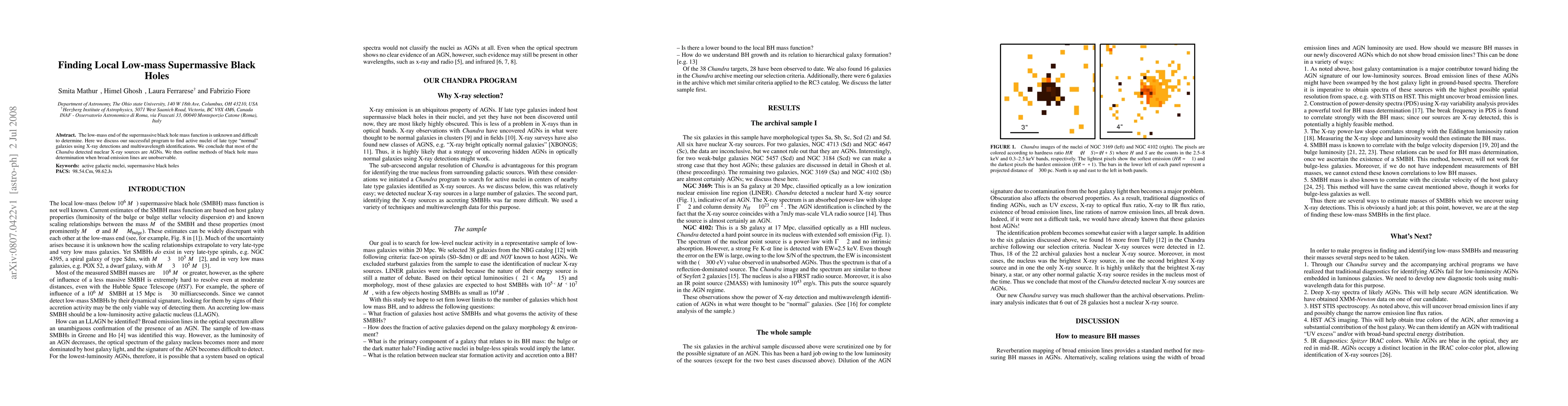 The low-mass end of the supermassive black hole mass function is unknown and difficult to determine. Here we discuss our successful program to find active nuclei of late type "normal" galaxies using X-ray detections and multiwavelength identifications. We conclude that most of the Chandra detected nuclear X-ray sources are AGNs. We then outline methods of black hole mass determination when broad emission lines are unobservable.