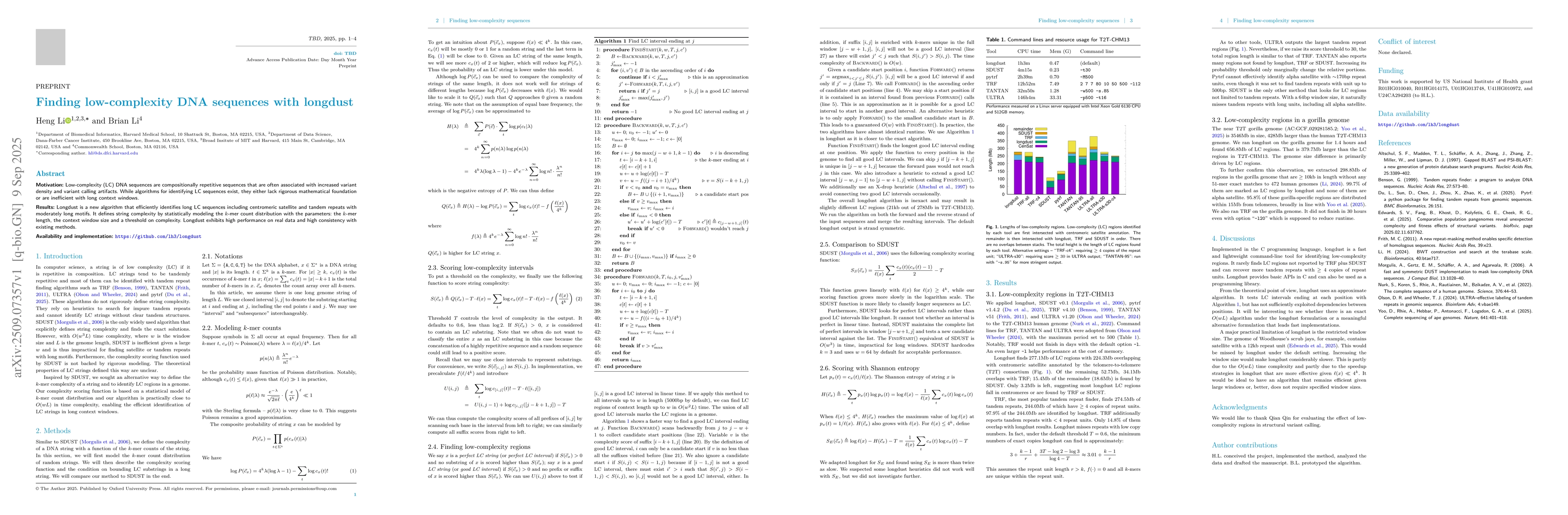 Motivation: Low-complexity (LC) DNA sequences are compositionally repetitive sequences that are often associated with increased variant density and variant calling artifacts. While algorithms for identifying LC sequences exist, they either lack rigorous mathematical foundation or are inefficient with long context windows. Results: Longdust is a new algorithm that efficiently identifies long LC sequences including centromeric satellite and tandem repeats with moderately long motifs. It defines string complexity by statistically modeling the k-mer count distribution with the parameters: the k-mer length, the context window size and a threshold on complexity. Longdust exhibits high performance on real data and high consistency with existing methods. Availability and implementation: https://github.com/lh3/longdust