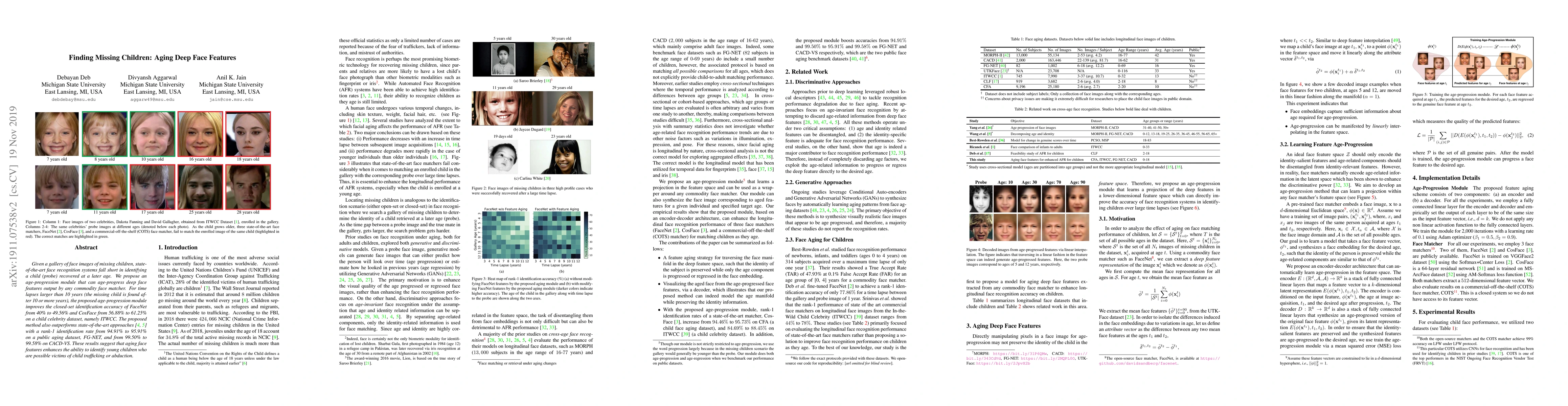 Given a gallery of face images of missing children, state-of-the-art face recognition systems fall short in identifying a child (probe) recovered at a later age. We propose an age-progression module that can age-progress deep face features output by any commodity face matcher. For time lapses larger than 10 years (the missing child is found after 10 or more years), the proposed age-progression module improves the closed-set identification accuracy of FaceNet from 40% to 49.56% and CosFace from 56.88% to 61.25% on a child celebrity dataset, namely ITWCC. The proposed method also outperforms state-of-the-art approaches with a rank-1 identification rate from 94.91% to 95.91% on a public aging dataset, FG-NET, and from 99.50% to 99.58% on CACD-VS. These results suggest that aging face features enhances the ability to identify young children who are possible victims of child trafficking or abduction.