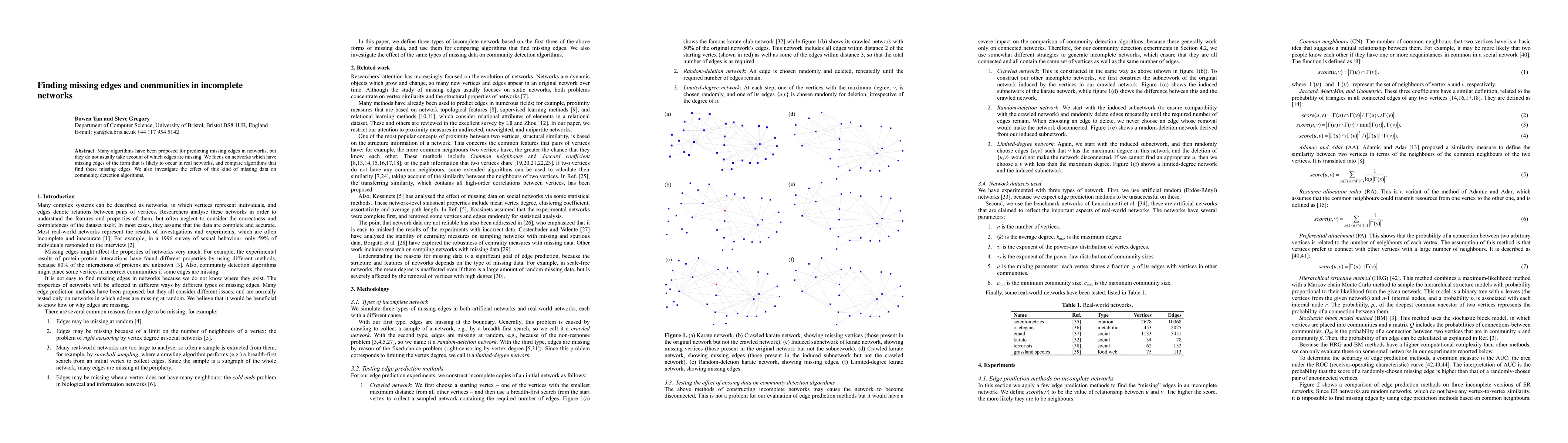 Many algorithms have been proposed for predicting missing edges in networks, but they do not usually take account of which edges are missing. We focus on networks which have missing edges of the form that is likely to occur in real networks, and compare algorithms that find these missing edges. We also investigate the effect of this kind of missing data on community detection algorithms.