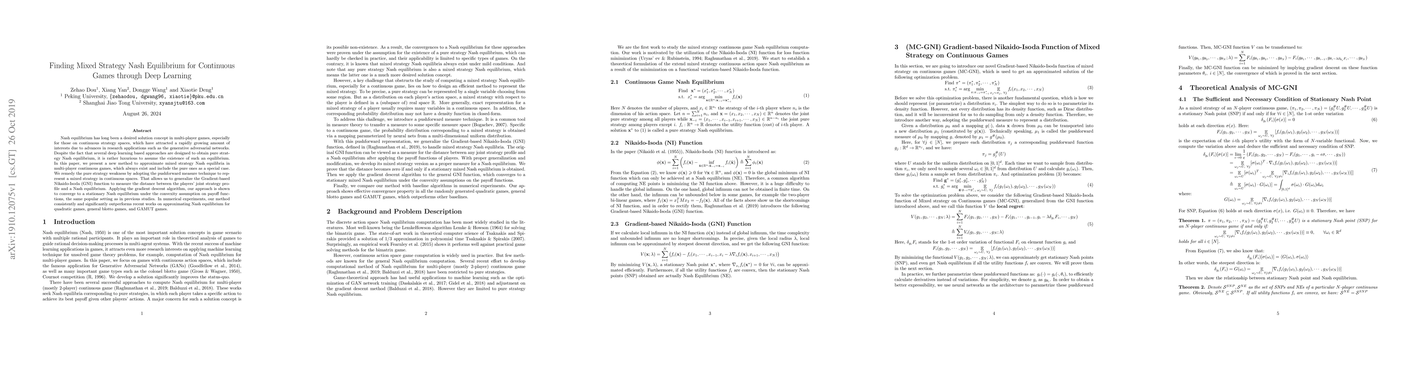 Nash equilibrium has long been a desired solution concept in multi-player games, especially for those on continuous strategy spaces, which have attracted a rapidly growing amount of interests due to advances in research applications such as the generative adversarial networks. Despite the fact that several deep learning based approaches are designed to obtain pure strategy Nash equilibrium, it is rather luxurious to assume the existence of such an equilibrium. In this paper, we present a new method to approximate mixed strategy Nash equilibria in multi-player continuous games, which always exist and include the pure ones as a special case. We remedy the pure strategy weakness by adopting the pushforward measure technique to represent a mixed strategy in continuous spaces. That allows us to generalize the Gradient-based Nikaido-Isoda (GNI) function to measure the distance between the players' joint strategy profile and a Nash equilibrium. Applying the gradient descent algorithm, our approach is shown to converge to a stationary Nash equilibrium under the convexity assumption on payoff functions, the same popular setting as in previous studies. In numerical experiments, our method consistently and significantly outperforms recent works on approximating Nash equilibrium for quadratic games, general blotto games, and GAMUT games.