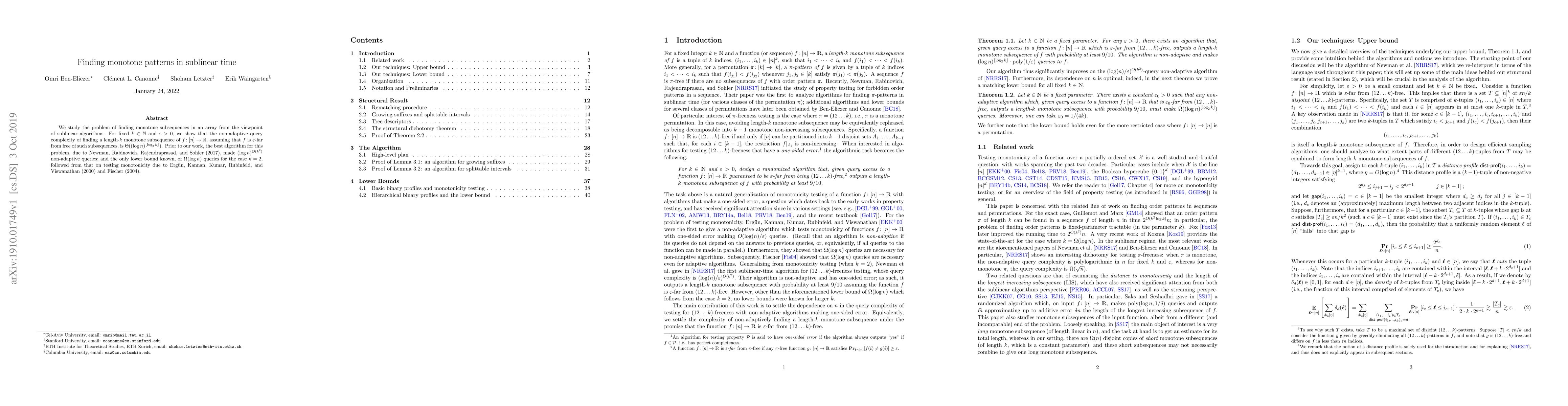 Researchers have improved the efficiency of finding monotone patterns in arrays, achieving sublinear query complexity of θ((» log n)∇ floor(log_2 k)) for a length-k monotone subsequence.
