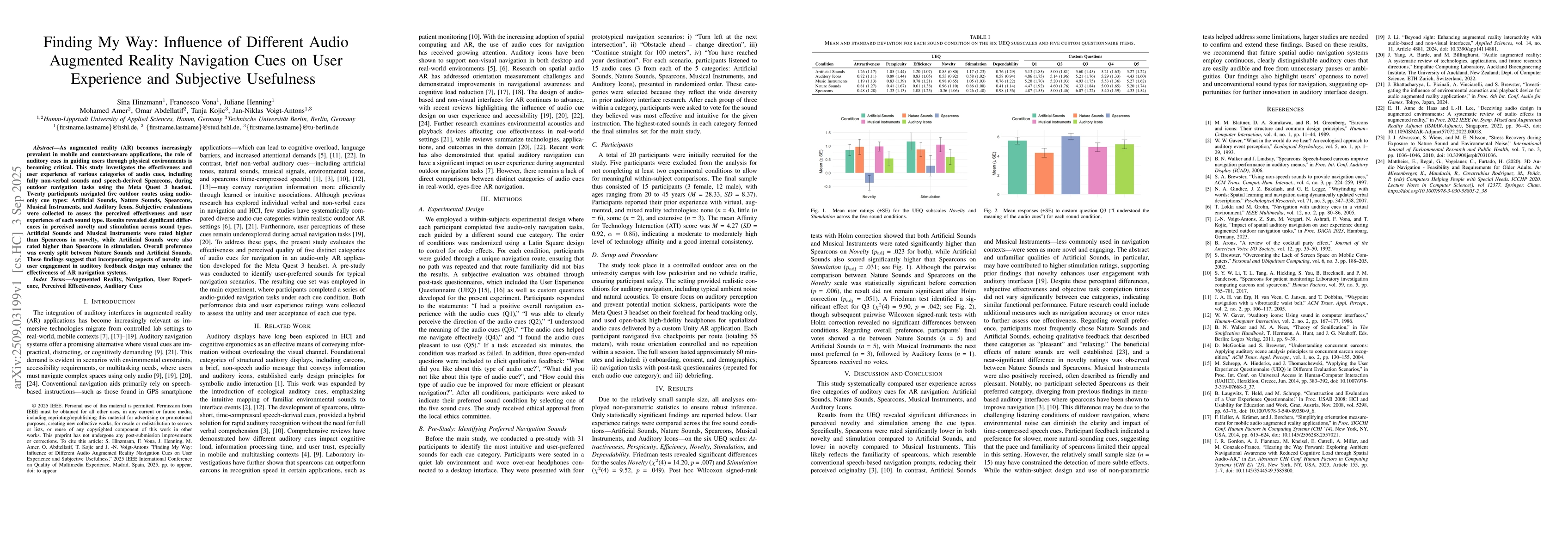 As augmented reality (AR) becomes increasingly prevalent in mobile and context-aware applications, the role of auditory cues in guiding users through physical environments is becoming critical. This study investigates the effectiveness and user experience of various categories of audio cues, including fully non-verbal sounds and speech-derived Spearcons, during outdoor navigation tasks using the Meta Quest 3 headset. Twenty participants navigated five outdoor routes using audio-only cue types: Artificial Sounds, Nature Sounds, Spearcons, Musical Instruments, and Auditory Icons. Subjective evaluations were collected to assess the perceived effectiveness and user experience of each sound type. Results revealed significant differences in perceived novelty and stimulation across sound types. Artificial Sounds and Musical Instruments were rated higher than Spearcons in novelty, while Artificial Sounds were also rated higher than Spearcons in stimulation. Overall preference was evenly split between Nature Sounds and Artificial Sounds. These findings suggest that incorporating aspects of novelty and user engagement in auditory feedback design may enhance the effectiveness of AR navigation systems.