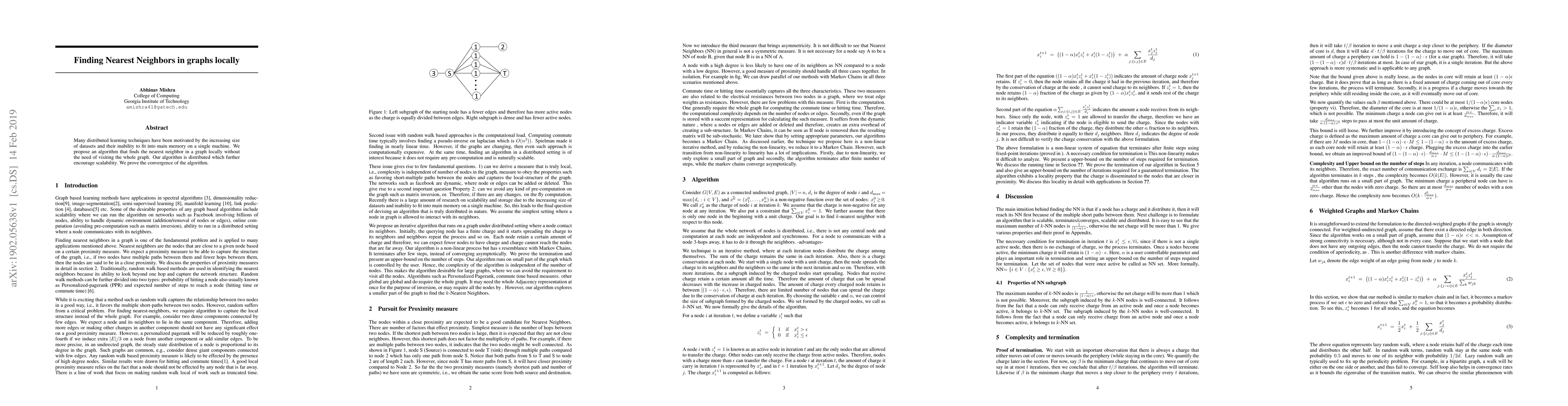 Summary: This paper proposes a distributed algorithm for finding nearest neighbors in graphs locally, avoiding the need to traverse the entire graph, thus enhancing scalability and efficiency for large datasets. The authors prove the convergence of their algorithm.