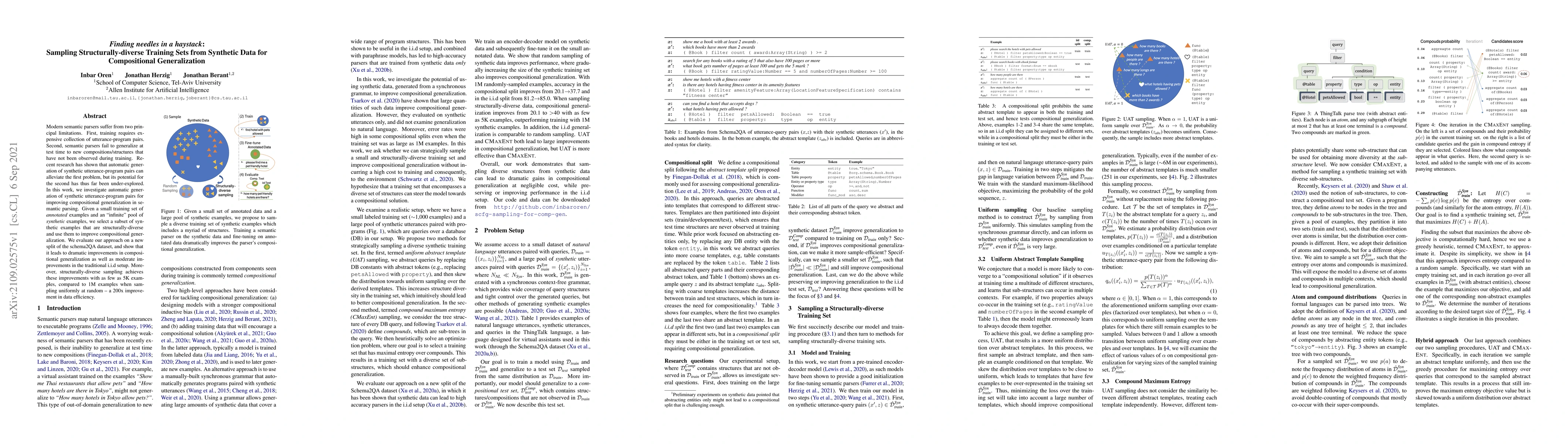 This paper explores the use of synthetically generated, structurally-diverse training examples to improve compositional generalization in semantic parsers, showing significant gains over traditional methods and demonstrating data efficiency with only 5K examples compared to 1M for random sampling.