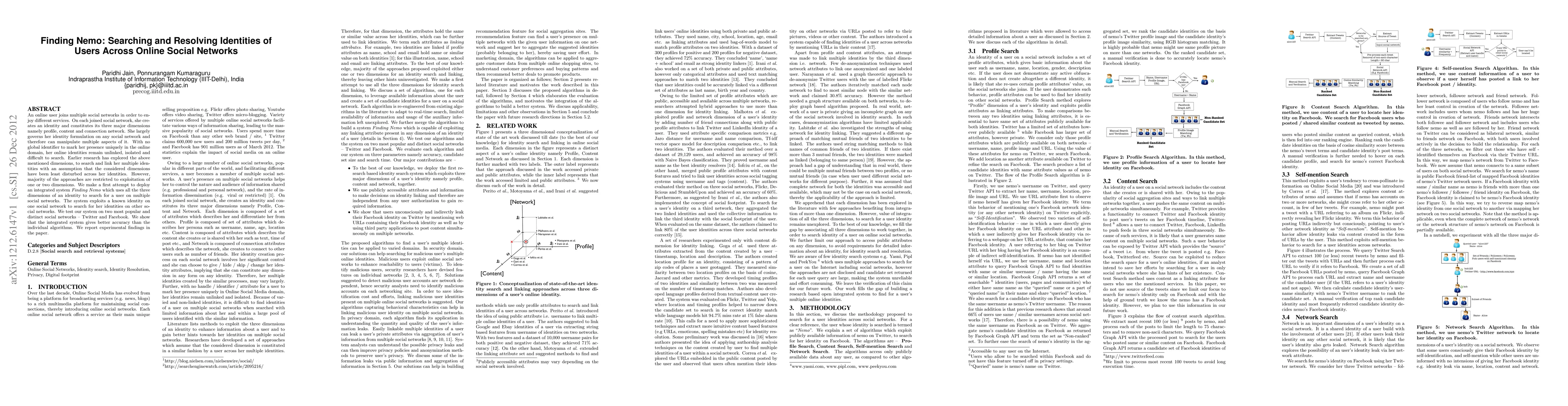 This paper introduces "Finding Nemo," an integrated system that searches and links online user identities across multiple social networks by utilizing all three identity dimensions: profile, content, and connection network. The system demonstrates higher accuracy in identifying users across platforms like Twitter and Facebook compared to individual dimension-based approaches.