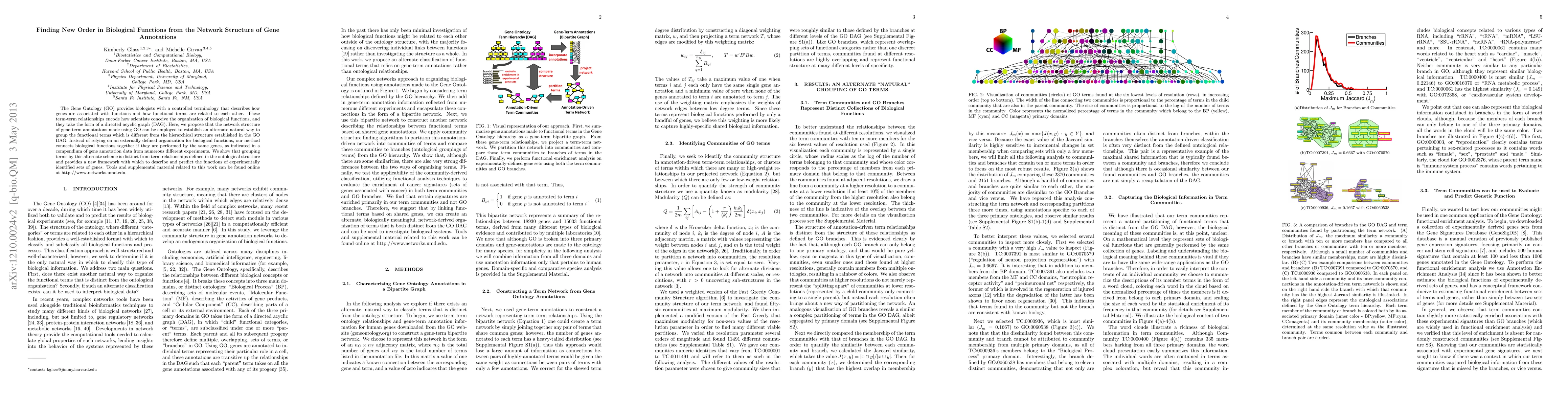 The Gene Ontology (GO) provides biologists with a controlled terminology that describes how genes are associated with functions and how functional terms are related to each other. These term-term relationships encode how scientists conceive the organization of biological functions, and they take the form of a directed acyclic graph (DAG). Here, we propose that the network structure of gene-term annotations made using GO can be employed to establish an alternate natural way to group the functional terms which is different from the hierarchical structure established in the GO DAG. Instead of relying on an externally defined organization for biological functions, our method connects biological functions together if they are performed by the same genes, as indicated in a compendium of gene annotation data from numerous different experiments. We show that grouping terms by this alternate scheme is distinct from term relationships defined in the ontological structure and provides a new framework with which to describe and predict the functions of experimentally identified sets of genes.