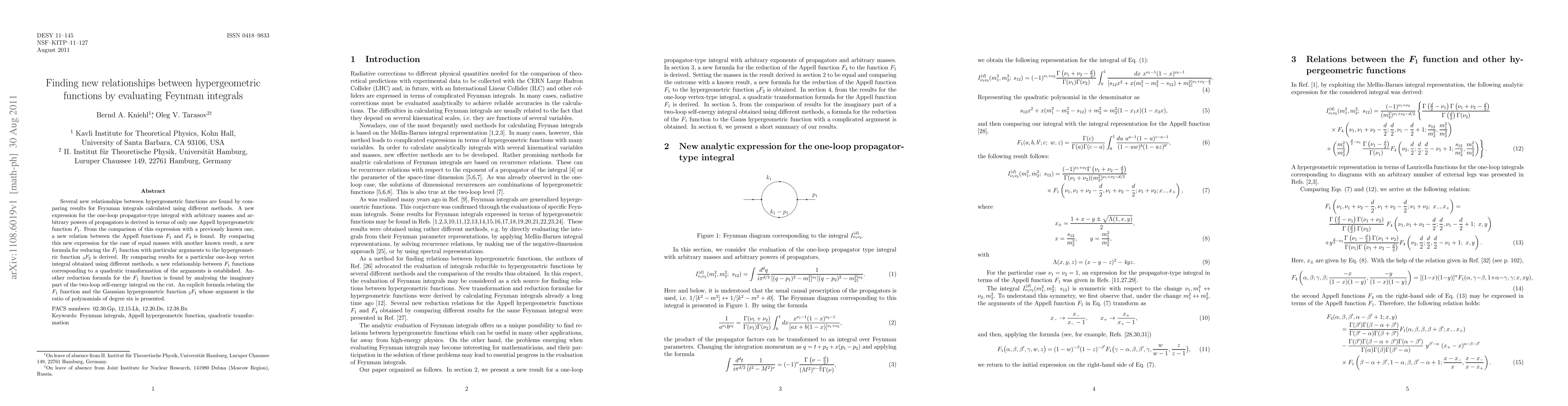 This paper discovers new relationships between hypergeometric functions by evaluating Feynman integrals, deriving a new expression for a one-loop propagator-type integral in terms of Appell hypergeometric function F_1, and establishing several new reduction formulas and transformations between F_1, F_4, and _3F_2 hypergeometric functions.
