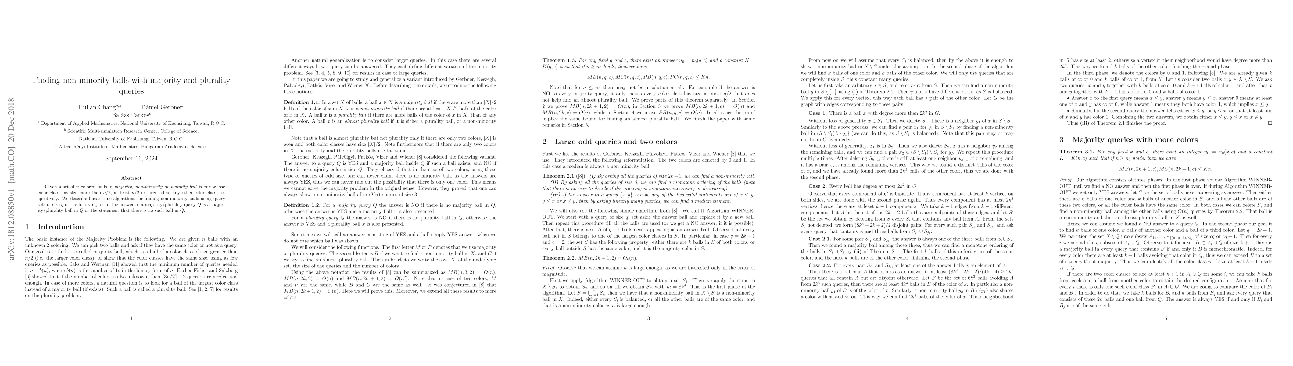Given a set of $n$ colored balls, a \textit{majority, non-minority or plurality ball} is one whose color class has size more than $n/2$, at least $n/2$ or larger than any other color class, respectively. We describe linear time algorithms for finding non-minority balls using query sets of size $q$ of the following form: the answer to a majority/plurality query $Q$ is a majority/plurality ball in $Q$ or the statement that there is no such ball in $Q$.