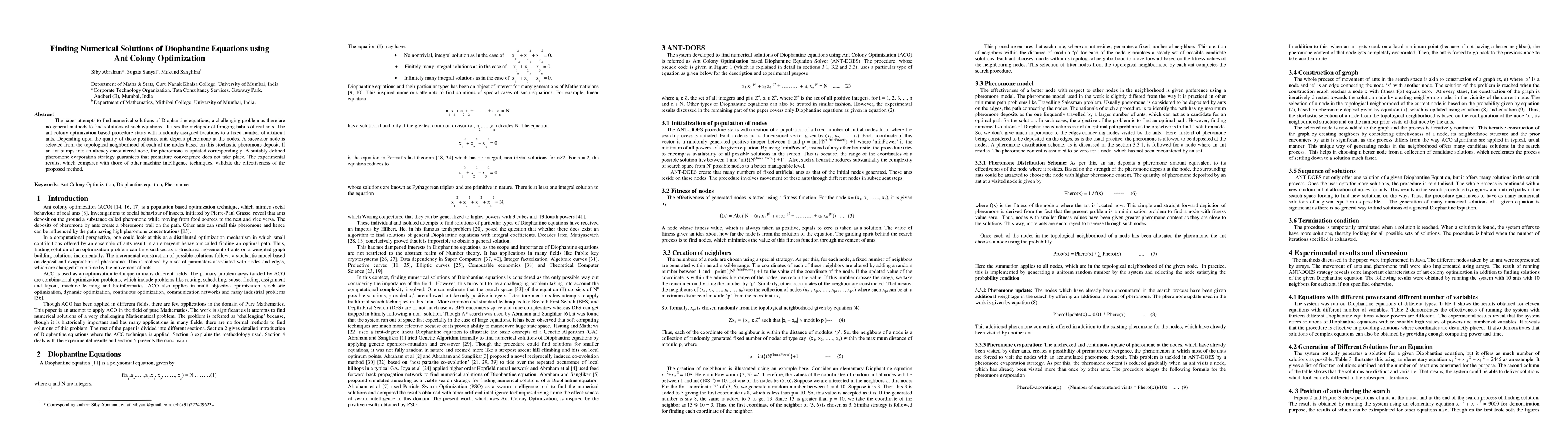 The paper attempts to find numerical solutions of Diophantine equations, a challenging problem as there are no general methods to find solutions of such equations. It uses the metaphor of foraging habits of real ants. The ant colony optimization based procedure starts with randomly assigned locations to a fixed number of artificial ants. Depending upon the quality of these positions, ants deposit pheromone at the nodes. A successor node is selected from the topological neighborhood of each of the nodes based on this stochastic pheromone deposit. If an ant bumps into an already encountered node, the pheromone is updated correspondingly. A suitably defined pheromone evaporation strategy guarantees that premature convergence does not take place. The experimental results, which compares with those of other machine intelligence techniques, validate the effectiveness of the proposed method.