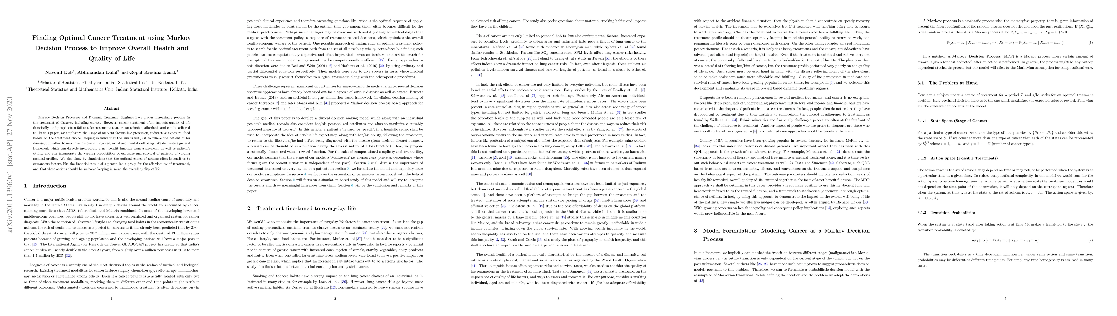 Markov Decision Processes and Dynamic Treatment Regimes have grown increasingly popular in the treatment of diseases, including cancer. However, cancer treatment often impacts quality of life drastically, and people often fail to take treatments that are sustainable, affordable and can be adhered to. In this paper, we emphasize the usage of ambient factors like profession, radioactive exposure, food habits on the treatment choice, keeping in mind that the aim is not just to relieve the patient of his disease, but rather to maximize his overall physical, social and mental well being. We delineate a general framework which can directly incorporate a net benefit function from a physician as well as patient's utility, and can incorporate the varying probabilities of exposure and survival of patients of varying medical profiles. We also show by simulations that the optimal choice of actions often is sensitive to extraneous factors, like the financial status of a person (as a proxy for the affordability of treatment), and that these actions should be welcome keeping in mind the overall quality of life.