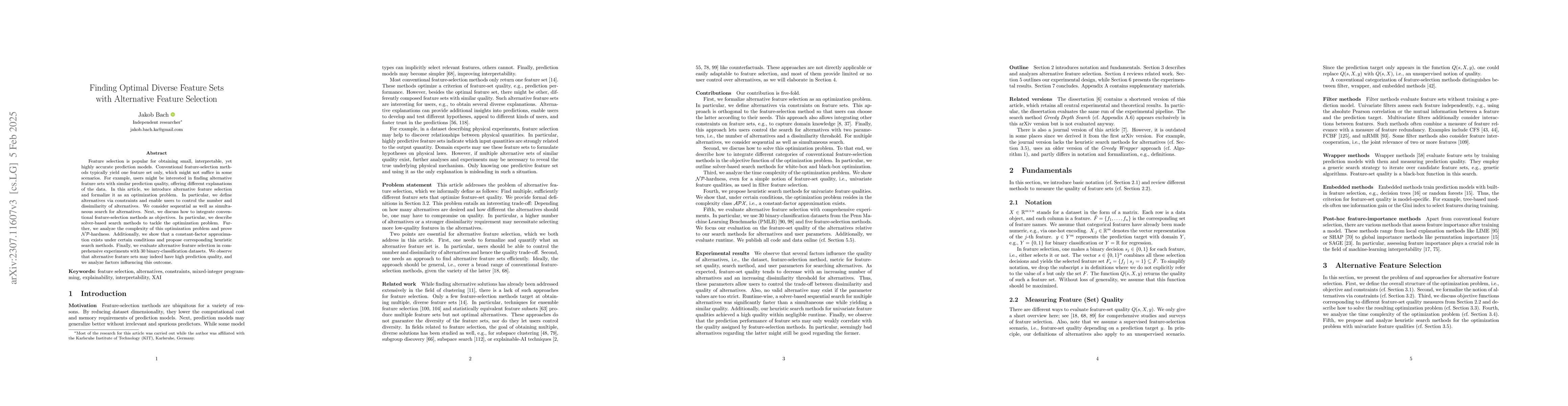 This paper introduces alternative feature selection as an optimization problem, allowing users to find multiple diverse feature sets with similar predictive accuracy. It discusses methods for integrating conventional feature selection techniques, analyzes the problem's complexity, and proposes heuristic methods for practical implementation, validated through experiments on 30 binary-classification datasets.