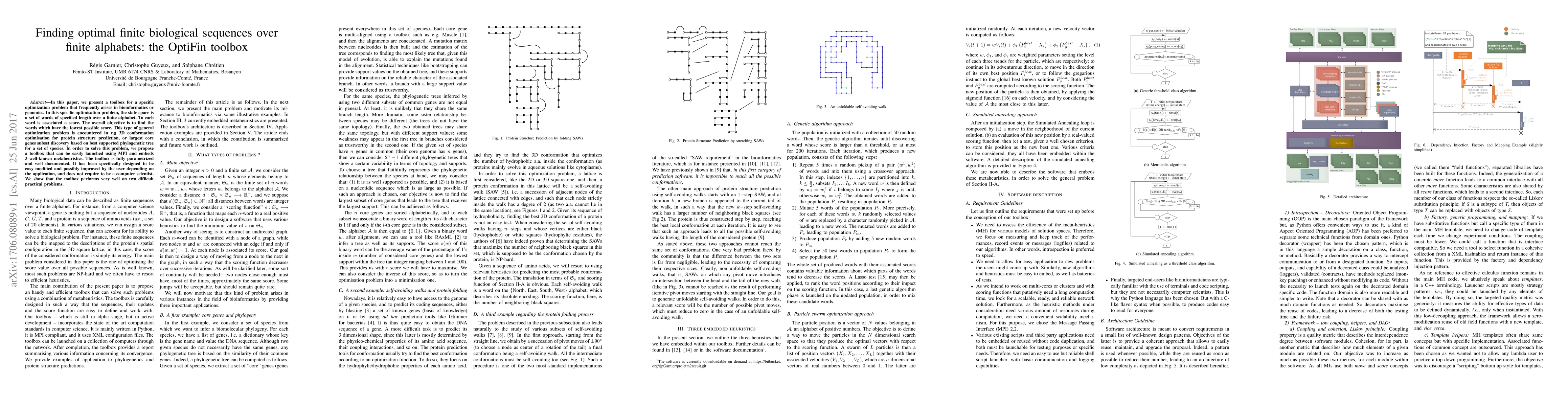 In this paper, we present a toolbox for a specific optimization problem that frequently arises in bioinformatics or genomics. In this specific optimisation problem, the state space is a set of words of specified length over a finite alphabet. To each word is associated a score. The overall objective is to find the words which have the lowest possible score. This type of general optimization problem is encountered in e.g 3D conformation optimisation for protein structure prediction, or largest core genes subset discovery based on best supported phylogenetic tree for a set of species. In order to solve this problem, we propose a toolbox that can be easily launched using MPI and embeds 3 well-known metaheuristics. The toolbox is fully parametrized and well documented. It has been specifically designed to be easy modified and possibly improved by the user depending on the application, and does not require to be a computer scientist. We show that the toolbox performs very well on two difficult practical problems.