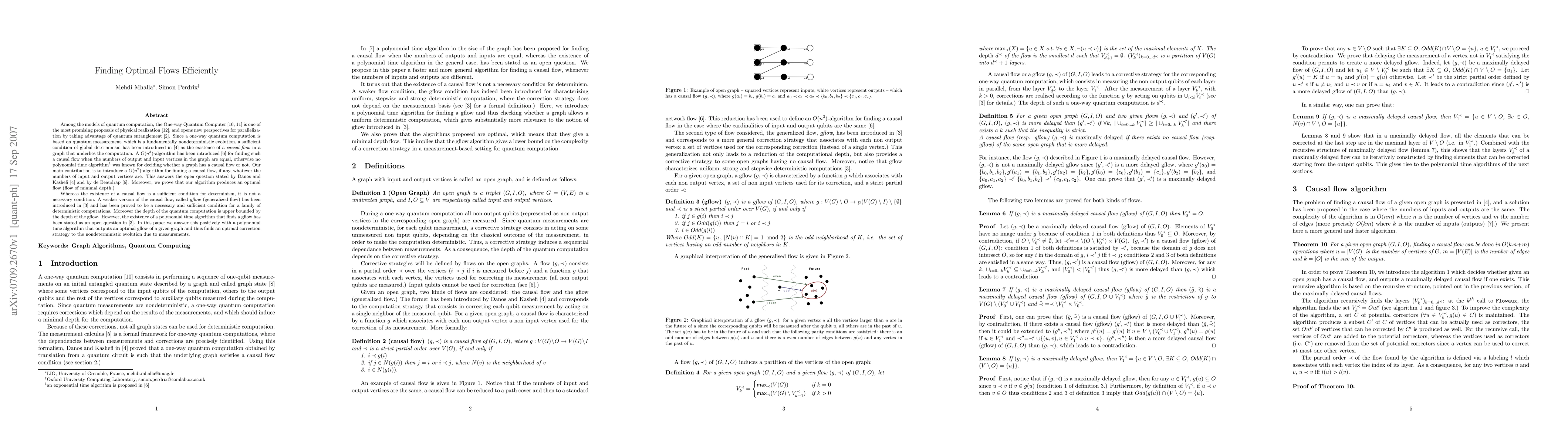 Among the models of quantum computation, the One-way Quantum Computer is one of the most promising proposals of physical realization, and opens new perspectives for parallelization by taking advantage of quantum entanglement. Since a one-way quantum computation is based on quantum measurement, which is a fundamentally nondeterministic evolution, a sufficient condition of global determinism has been introduced as the existence of a causal flow in a graph that underlies the computation. A O(n^3)-algorithm has been introduced for finding such a causal flow when the numbers of output and input vertices in the graph are equal, otherwise no polynomial time algorithm was known for deciding whether a graph has a causal flow or not. Our main contribution is to introduce a O(n^2)-algorithm for finding a causal flow, if any, whatever the numbers of input and output vertices are. This answers the open question stated by Danos and Kashefi and by de Beaudrap. Moreover, we prove that our algorithm produces an optimal flow (flow of minimal depth.) Whereas the existence of a causal flow is a sufficient condition for determinism, it is not a necessary condition. A weaker version of the causal flow, called gflow (generalized flow) has been introduced and has been proved to be a necessary and sufficient condition for a family of deterministic computations. Moreover the depth of the quantum computation is upper bounded by the depth of the gflow. However, the existence of a polynomial time algorithm that finds a gflow has been stated as an open question. In this paper we answer this positively with a polynomial time algorithm that outputs an optimal gflow of a given graph and thus finds an optimal correction strategy to the nondeterministic evolution due to measurements.