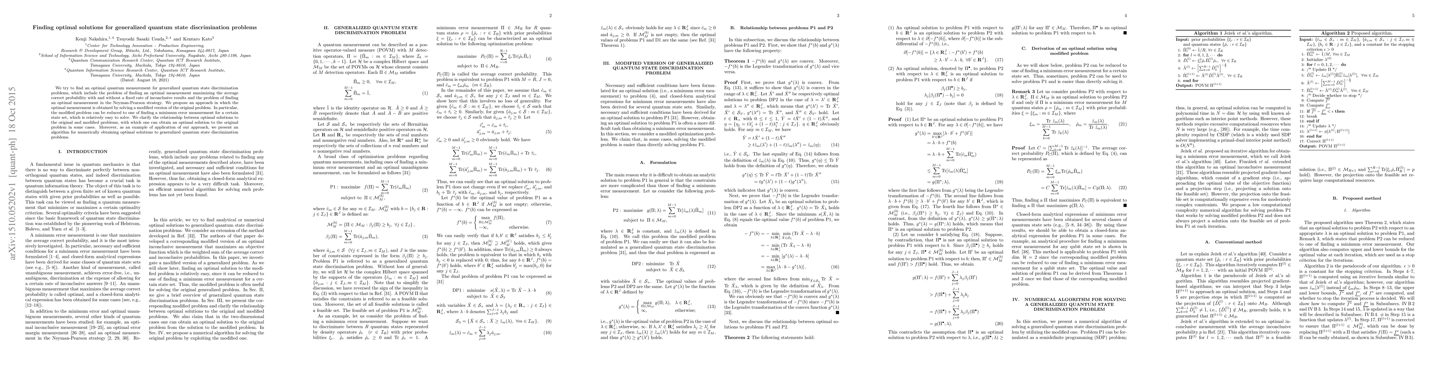 This paper proposes an approach to solve optimal quantum measurement problems in generalized state discrimination, transforming the original problem into a simpler minimum error measurement problem. The authors provide an algorithm for numerically obtaining optimal solutions and clarify the relationship between the original and modified problems.